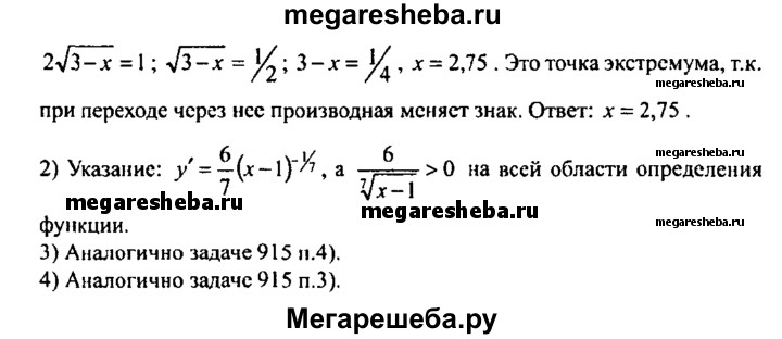 919. Найти точки экстремума функции: 1) у= х + √3-x; 2) у = (х-1)^6/7; 3) у = х - sin 2х; 4) у = cos Зх - Зх.