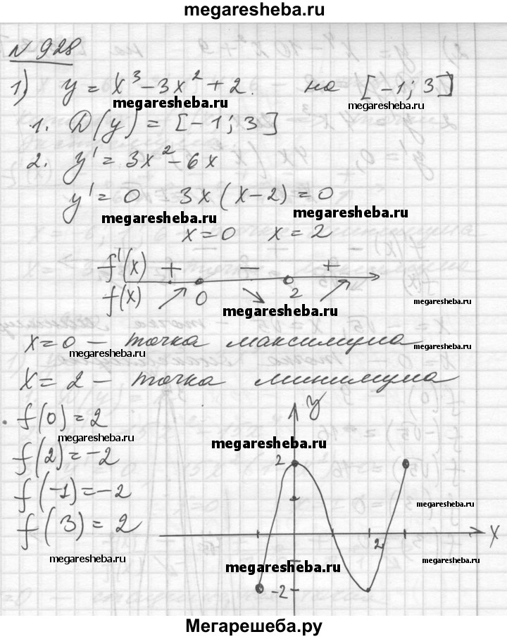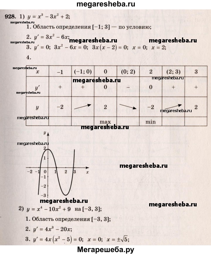 928. Построить график функции: 1) у = х^3 – Зх^2 + 2 на отрезке [-1; 3]; 2) у = х^4 - 10х^2 + 9 на отрезке [-3; 3].