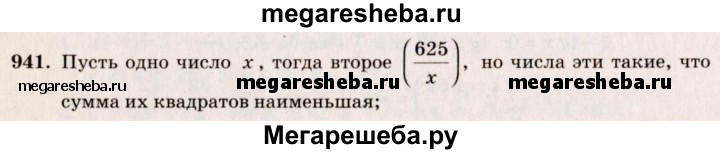 941. Записать число 625 в виде произведения двух положительных чисел так, чтобы сумма их квадратов была наименьшей.