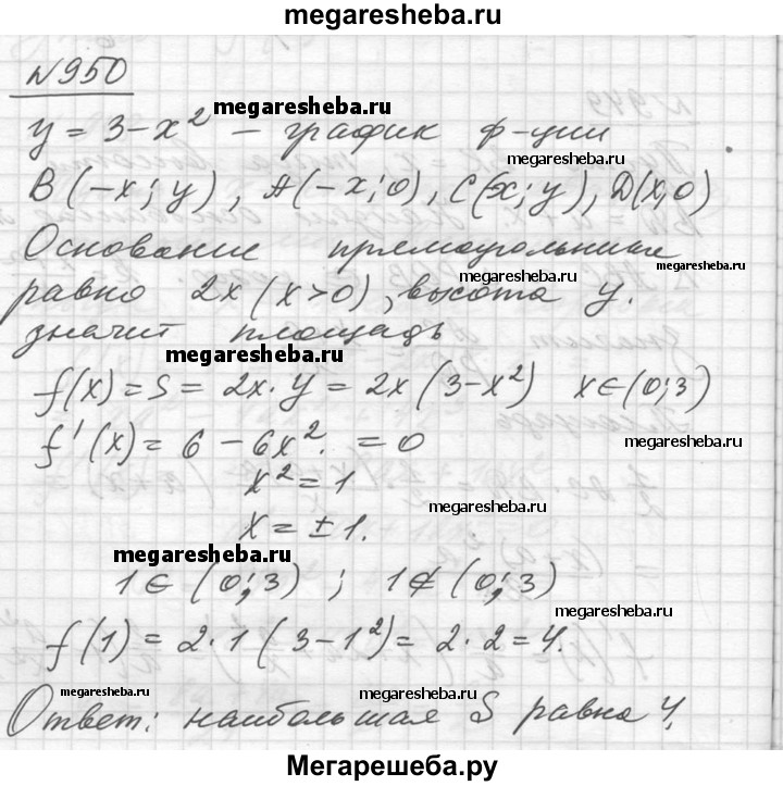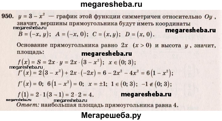 950. Из всех прямоугольников, у которых одна вершина лежит на оси Ох, вторая — на положительной полуоси Оу, третья — в начале координат, а четвёртая — на параболе у = 3-х^2, выбран прямоугольник с наибольшей площадью. Найти эту площадь.