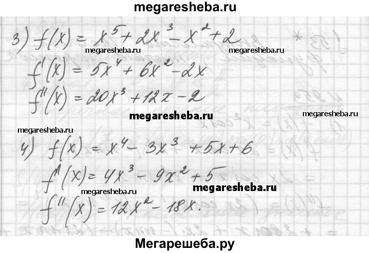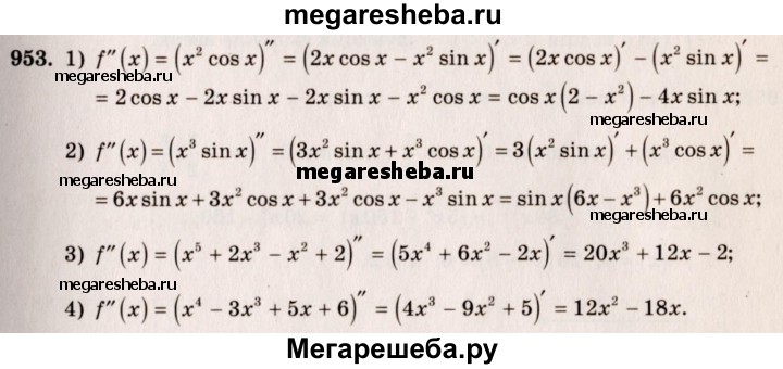 953. Найти f " (х), если: 1) f (х) = х^2 cos х; 2) f (х) = х^3 sin х; 3) f (х) = х^5 + 2х^3 – х^2 + 2; 4) f (х) = х^4 – Зх^3 + 5х + 6.