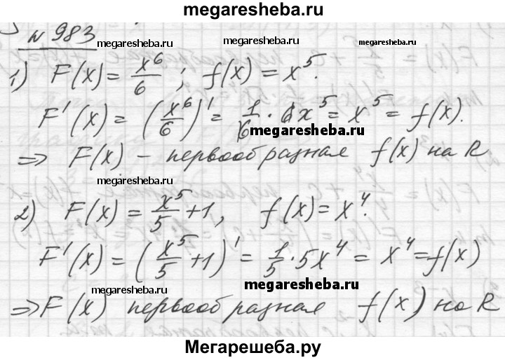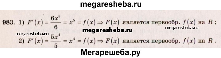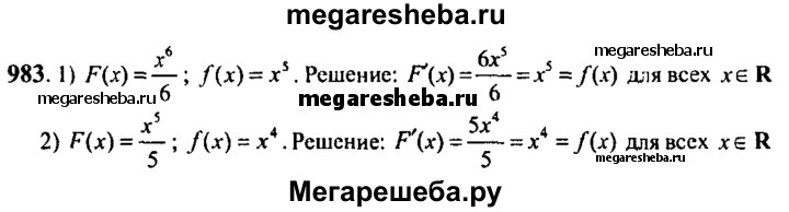 983. Показать, что функция F (х) является первообразной функции f (х) на всей числовой прямой: 1) F(x) = x^6, f(x) = x^5; 2) F (х) =x^5/5 + 1, f(x) = x^4.