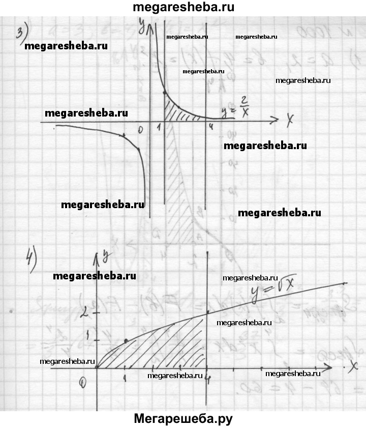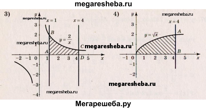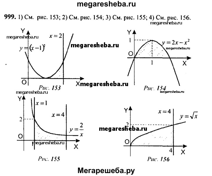 999. Изобразить криволинейную трапецию, ограниченную: 1) графиком функции у = (х - 1)^2, осью Ох и прямой х = 2; 2) графиком функции у = 2х – х^2 и осью Ох; 3) графиком функции y = 2/x, осью Ох и прямыми х = 1, х = 4; 4) графиком функции у = у√х, осью Ох и прямой х = 4.