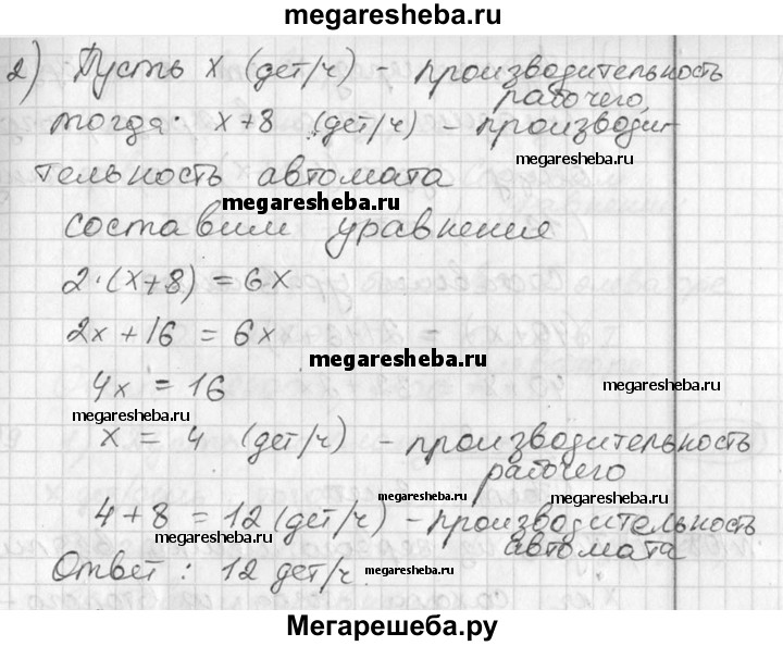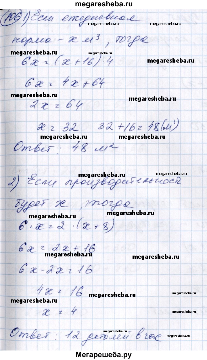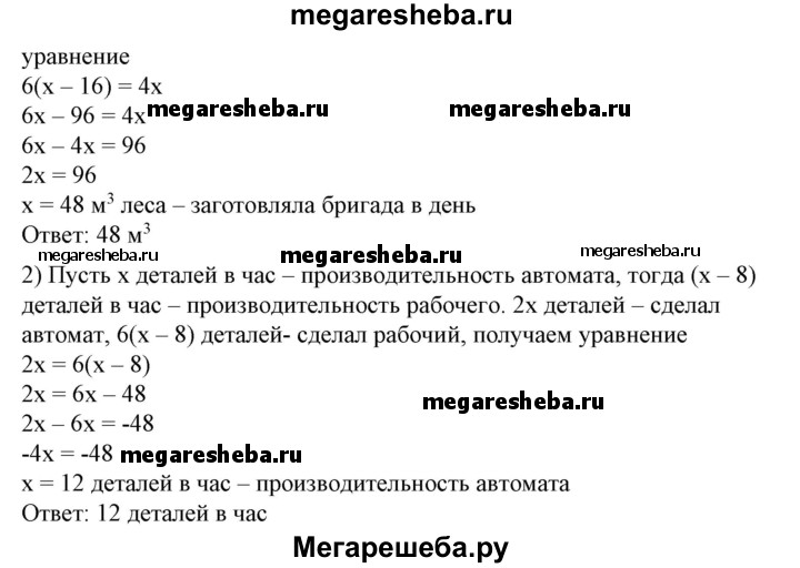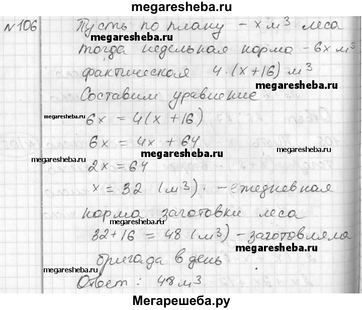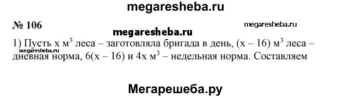 106 1) Бригада лесорубов ежедневно перевыполняла норму по заготовке леса на 16 м3, поэтому недельную норму (6 рабочих дней) она выполнила за 4 дня. Сколько кубометров леса заготовляла бригада в день? 2) В цехе поставили автомат, производительность которого была на 8 деталей в час выше производительности рабочего. После 2 ч работы автомат выполнил шестичасовую норму рабочего. Какова производительность автомата?