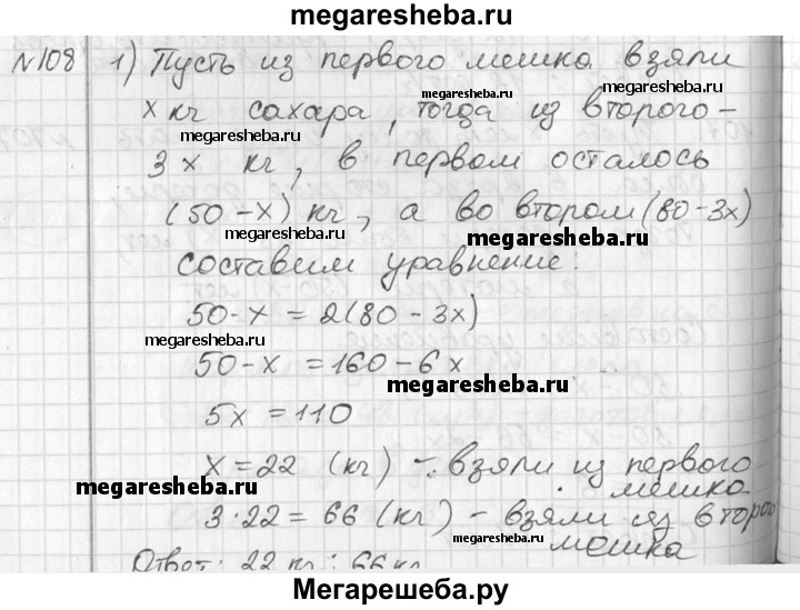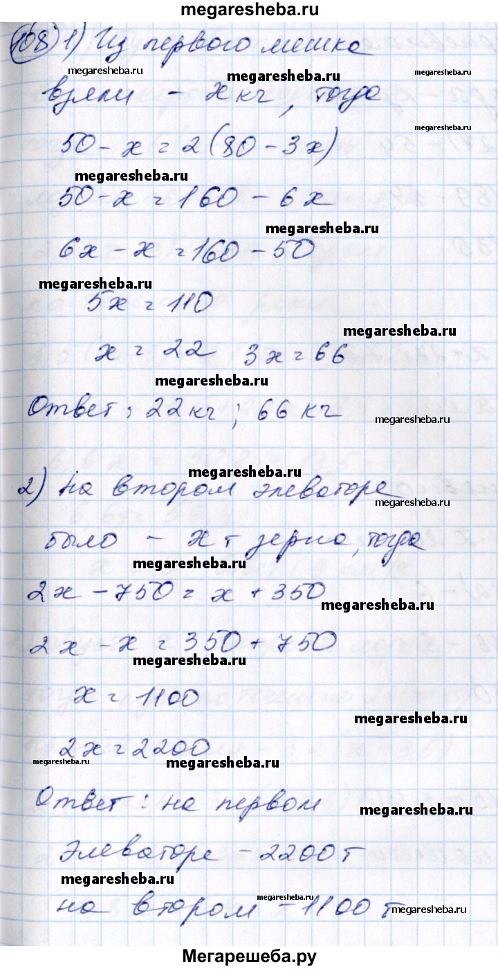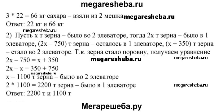 108 1) В первом мешке было 50 кг сахара, а во втором — 80 кг. Из второго мешка взяли сахара в 3 раза больше, чем из первого, и тогда в первом мешке сахара осталось вдвое больше, чем во втором. Сколько килограммов сахара взяли из каждого мешка? 2) В одном элеваторе было зерна в 2 раза больше, чем в другом. Из первого элеватора вывезли 750 т зерна, на второй элеватор привезли 350 т, после чего в обоих элеваторах зерна стало поровну. Сколько зерна было первоначально в каждом элеваторе?