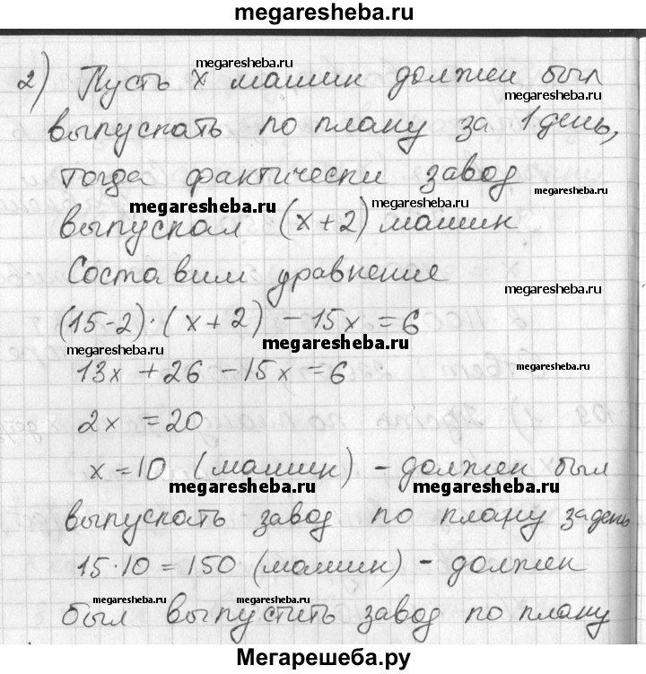 109 1) Бригада должна была выполнить заказ за 10 дней. Ежедневно перевыполняя норму на 27 деталей, бригада за 7 дней работы не только выполнила задание, но еще изготовила дополнительно 54 детали. Сколько деталей в день изготовляла бригада? 2) Заказ по выпуску машин завод должен был выполнить за 15 дней. Но уже за 2 дня до срока завод не только выполнил план, но и выпустил сверх плана еще 6 машин, так как ежедневно выпускал по 2 машины сверх плана. Сколько машин должен был выпустить завод по плану?