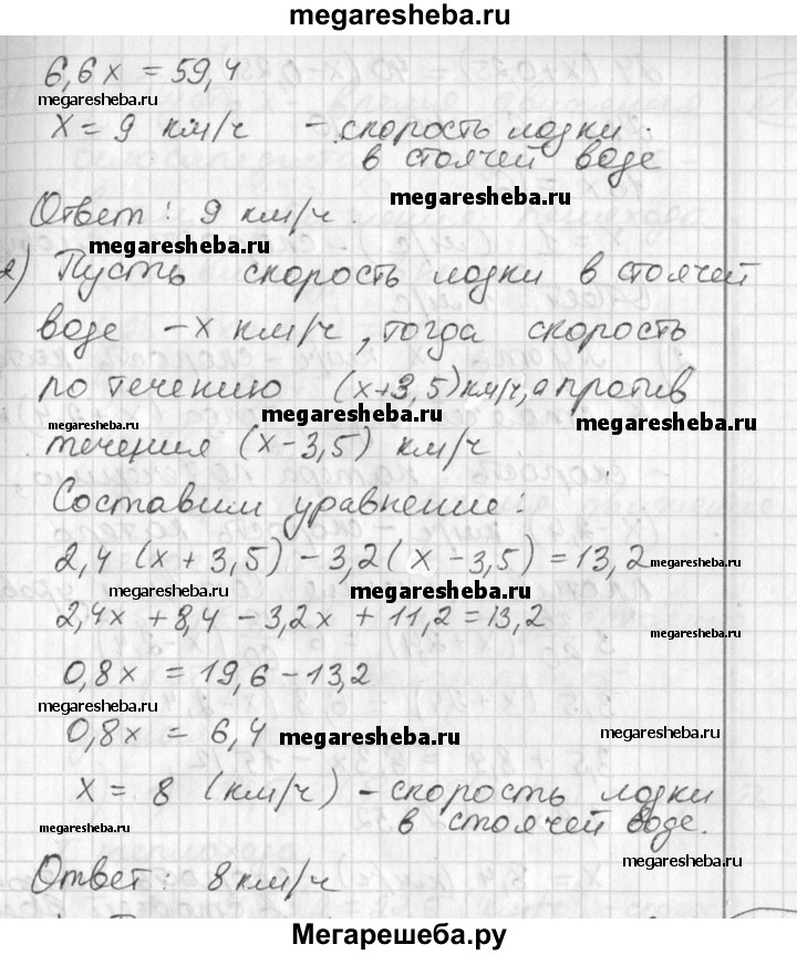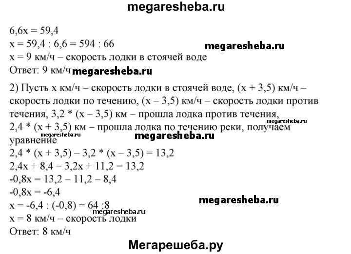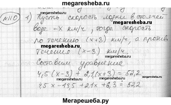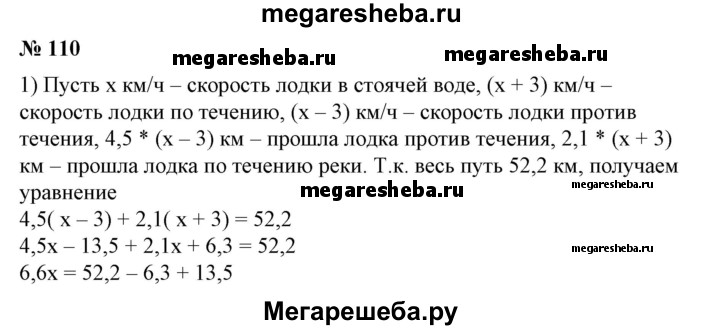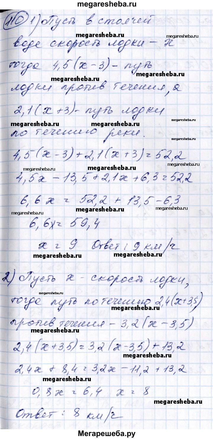 110 1) Лодка шла против течения реки 4,5 ч и по течению 2,1 ч. Найти скорость лодки в стоячей воде, если она прошла всего 52,2 км, а скорость течения реки равна 3 км/ч. 2) Лодка шла по течению реки 2,4 ч и против течения 3,2 ч. Путь, пройденный лодкой по течению, оказался на 13,2 км длиннее пути, пройденного против течения. Найти скорость лодки в стоячей воде, если скорость течения реки равна 3,5 км/ч.