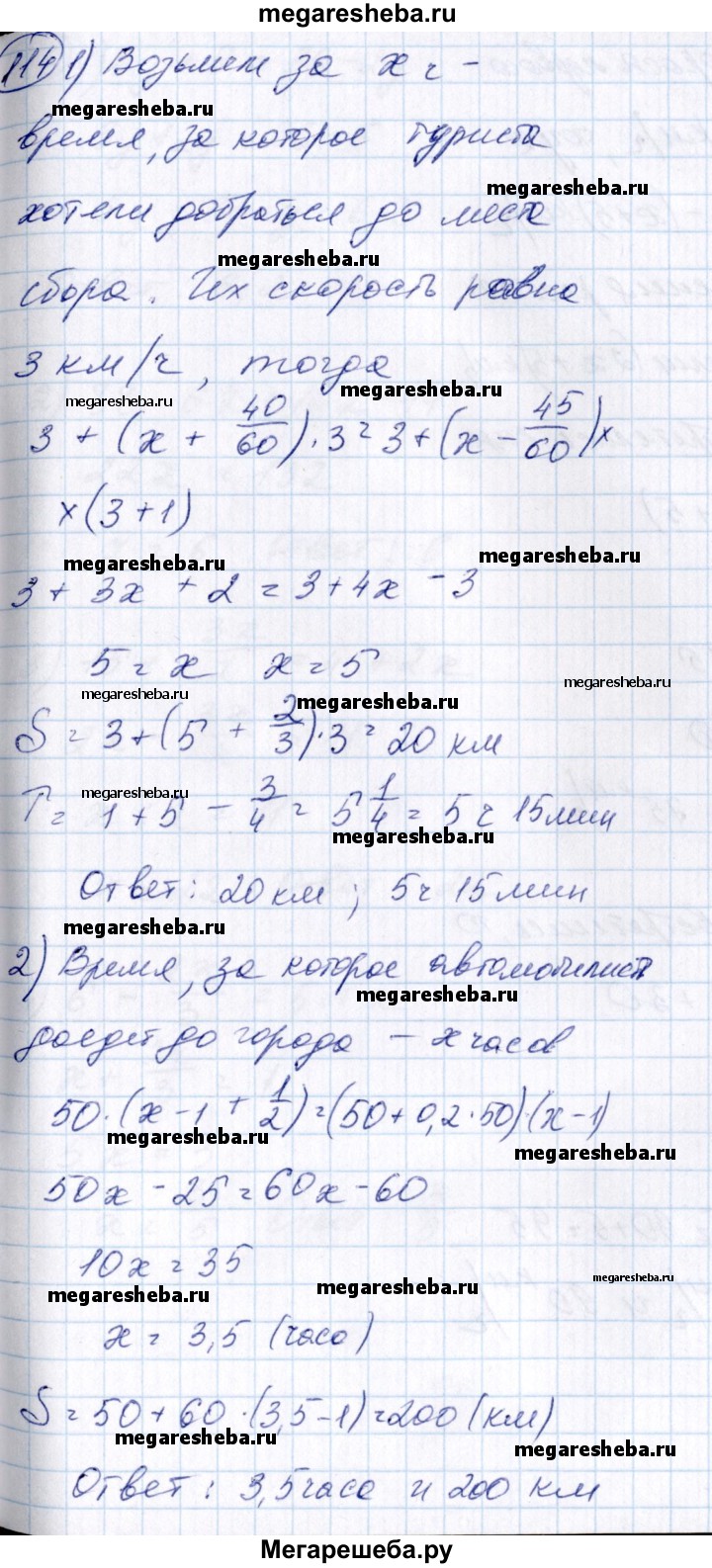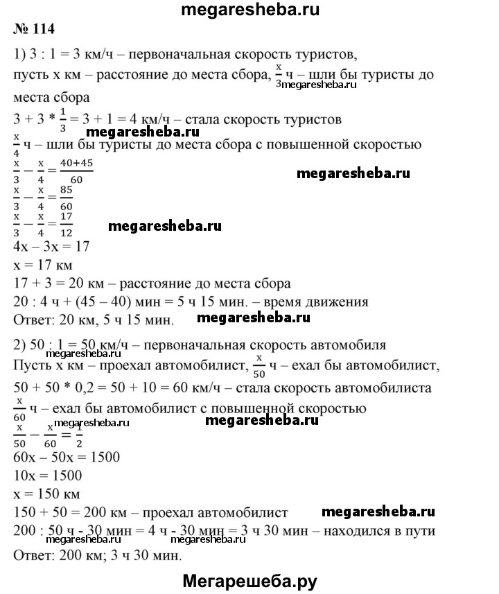 114 1) Туристы за первый час прошли 3 км. Если бы они продолжали двигаться с той же скоростью, то опоздали бы к месту сбора на 40 мин, поэтому они увеличили скорость на 1/3 и и пришли к месту сбора за 45 мин до назначенного срока. Какое расстояние прошли туристы до места сбора и за какое время? 2) Первый час автомобилист ехал со скоростью 50 км/ч и рассчитал, что если он и дальше будет ехать с той же скоростью, то опоздает в город на полчаса. Он увеличил скорость на 20% и прибыл в город вовремя. Какой путь проехал автомобилист и сколько времени он находился в пути?