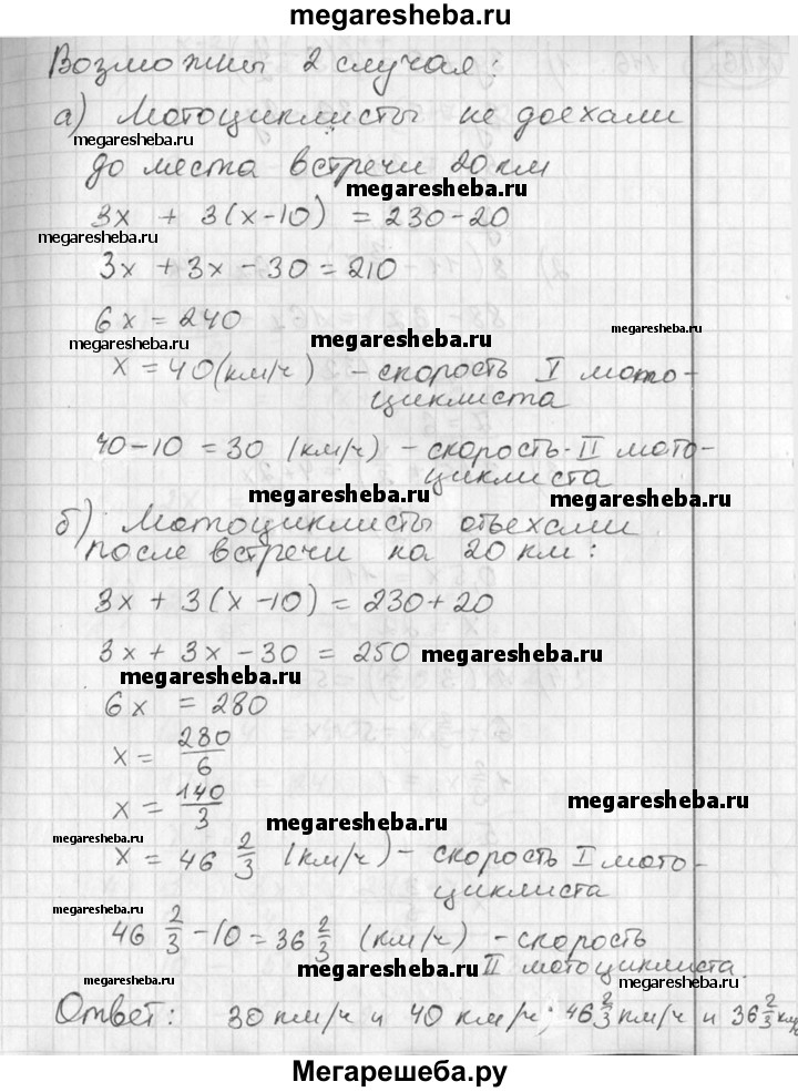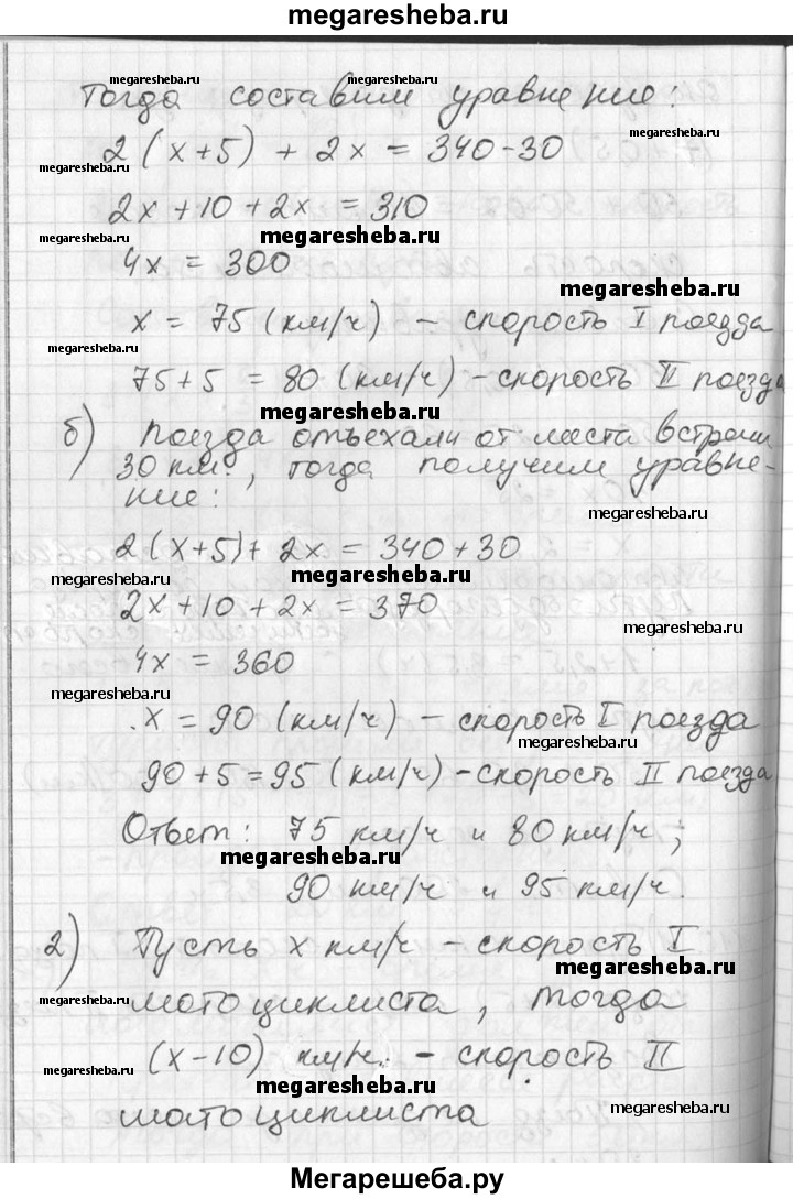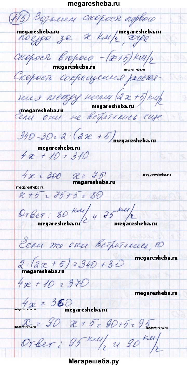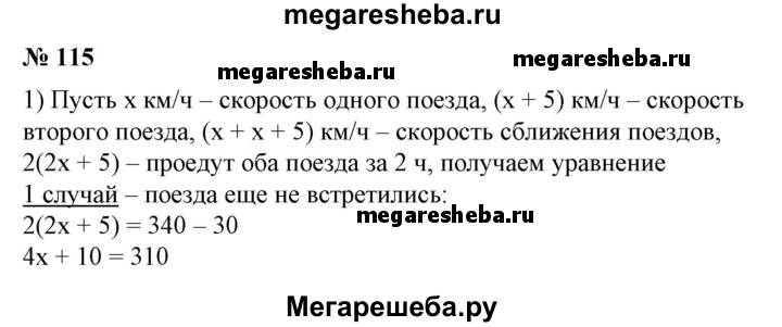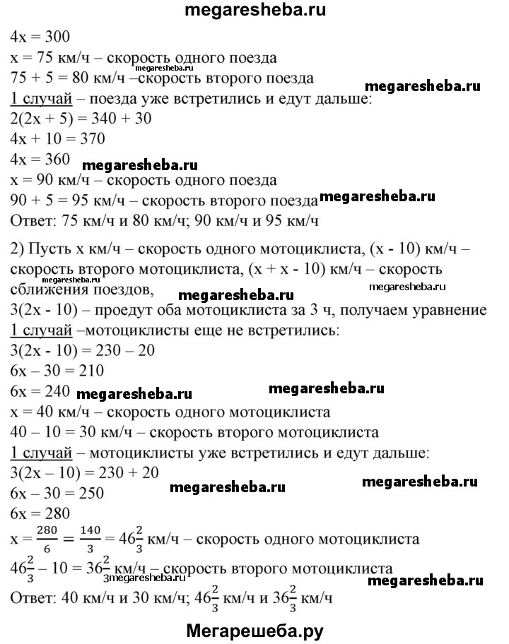 115 1) Из двух пунктов, расстояние между которыми 340 км, вышли одновременно навстречу друг другу два поезда. Скорость одного на 5 км/ч больше скорости другого. Найти скорости поездов, если известно, что через 2 ч после начала движения расстояние между ними было 30 км. 2) Из городов А и В, расстояние между которыми 230 км, од-новременно выехали навстречу друг другу два мотоциклиста. Через 3 ч после начала движения расстояние между ними было 20 км. Найти скорости мотоциклистов, если скорость одного на 10 км/ч меньше скорости другого.