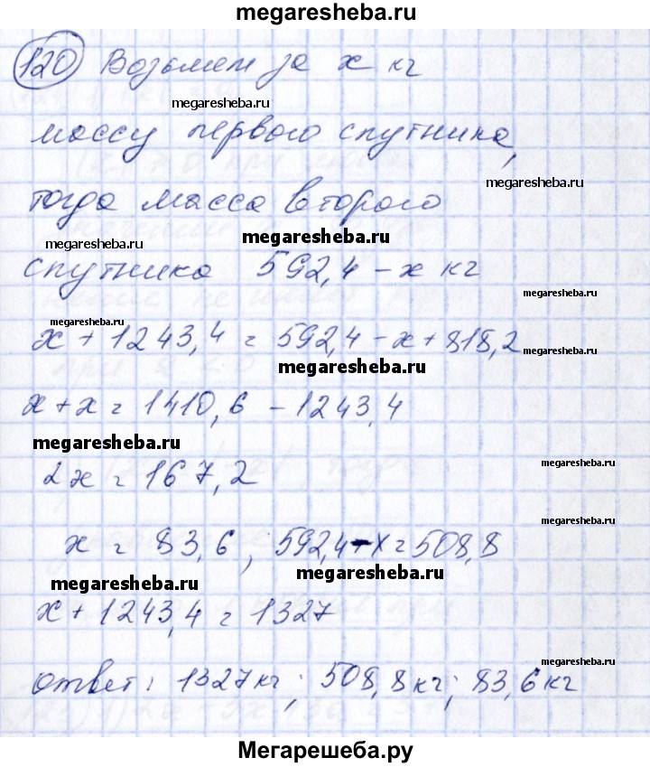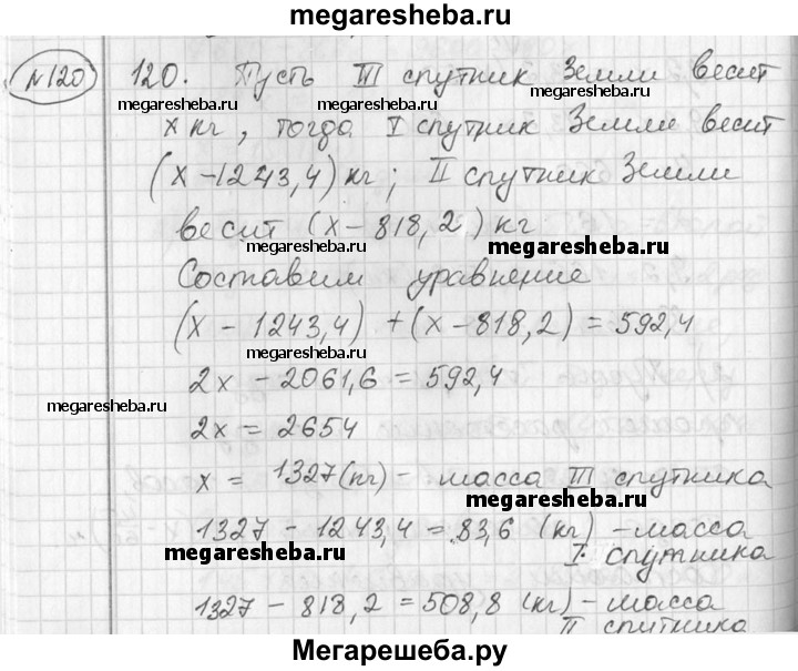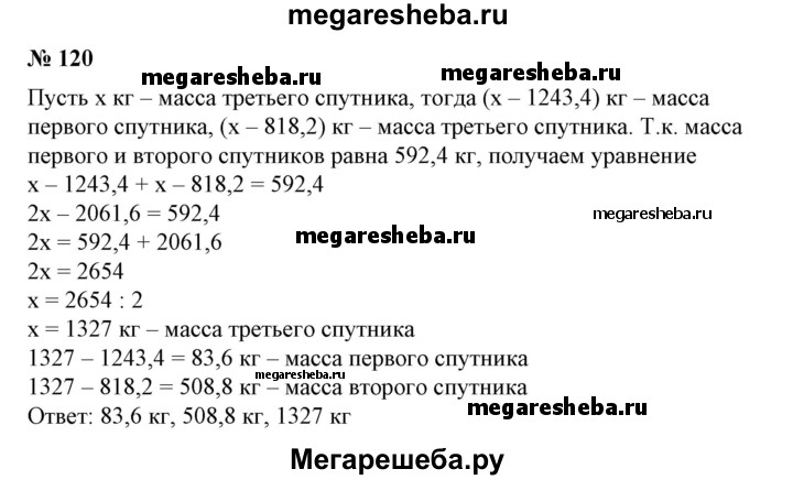 120 Суммарная масса первого и второго советских искусственных спутников Земли составила 592,4 кг. Первый спутник был легче третьего на 1243,4 кг, второй — на 818,2 кг. Найти массу каждого из трех первых искусственных спутников Земли.