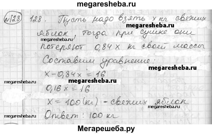128. Яблоки при сушке теряют 84% своей массы. Сколько надо взять свежых яблок, чтобы приготовить 16 кг сушеных?