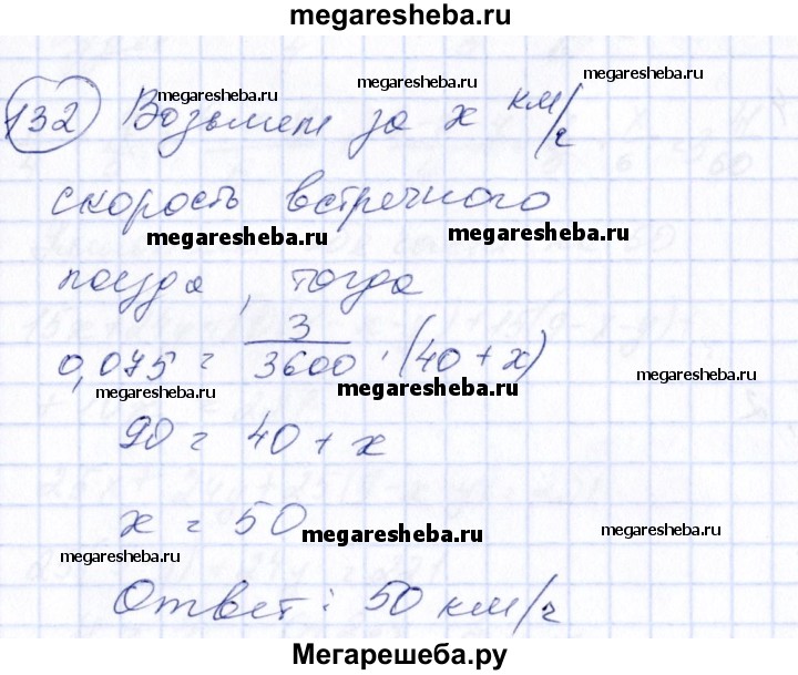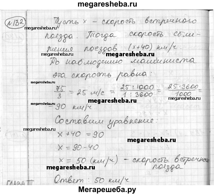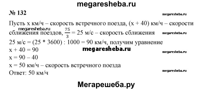 132. Поезд идет со скоростью 40 км/ч. По наблюдению машиниста встречный поезд, длина которого 75 м, проходит мимо него за 3 с. Какова скорость движения встречного поезда? Вычислить: 7 • 24 - 5 • З2.