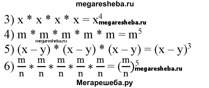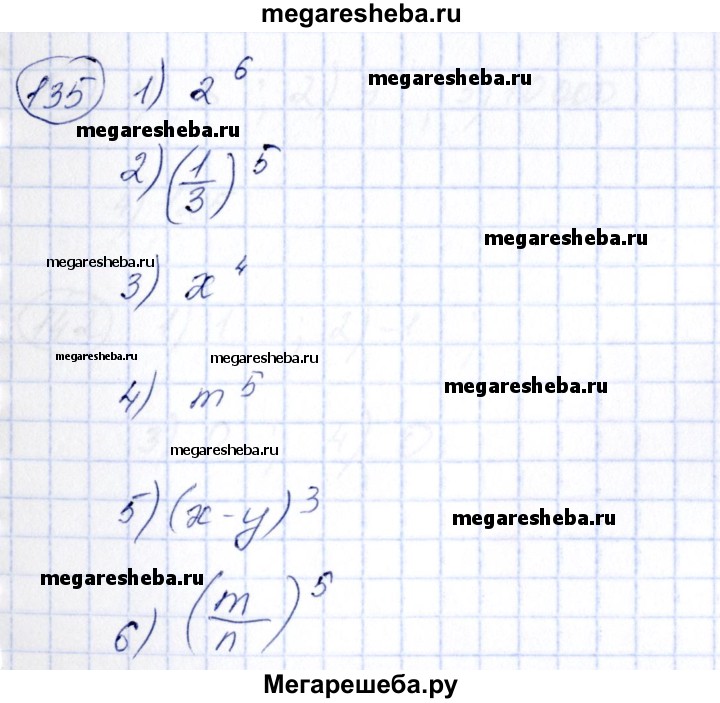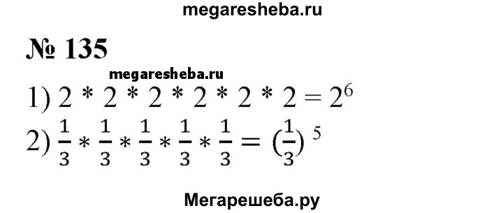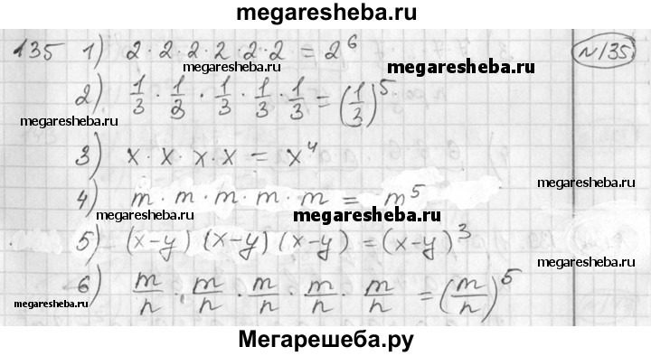 135 Записать произведение в виде степени: 1) 2-2-2-2-2-2; 2) 1/3 • 1/3 • 1/3 • 1/3 • 1/3 3) x • х • х • х; 4) m • m • m • m• m; 5) (х-у)-(х-у)-(х-у); 6) m/n• m/n• m/n• m/n• m/n