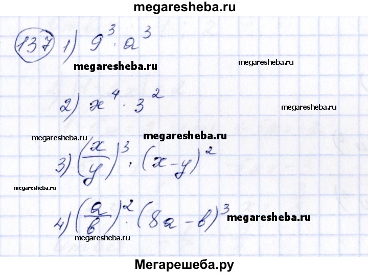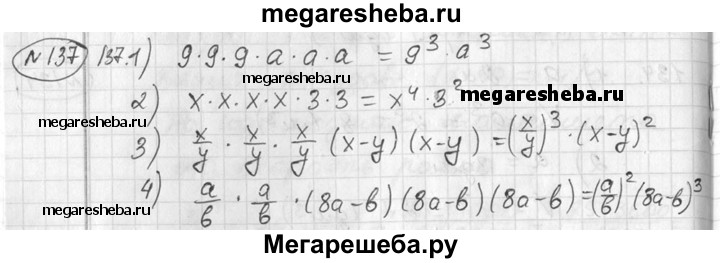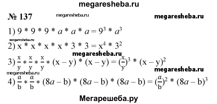 137 1) 9 •9 •9 •а •а •а; 2) х•х• х• х•3•3; 3) x/y• x/y• x/y• (х-у)•( х-у); 4) a/b•a/b •(8a – b)(8a-b).
