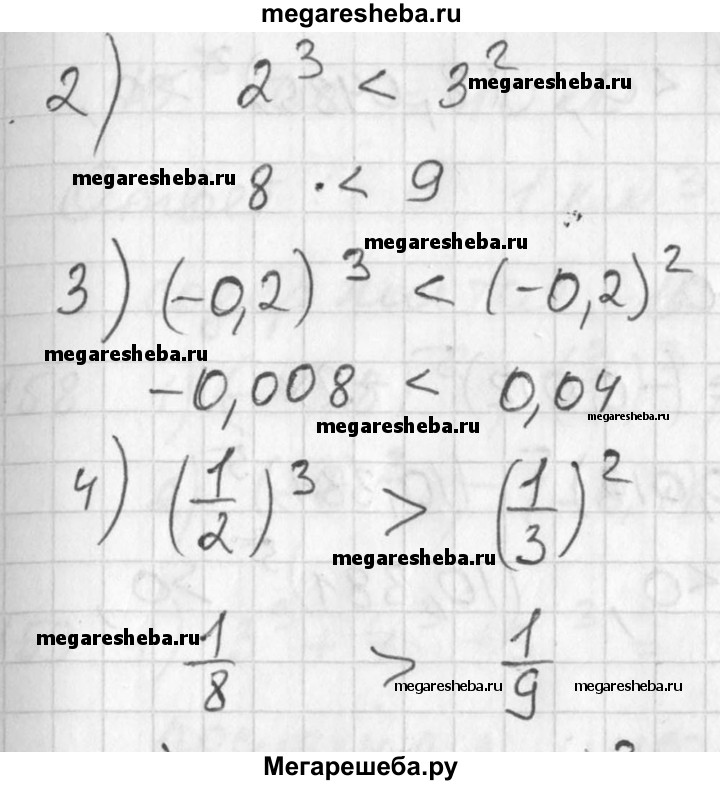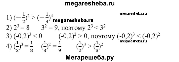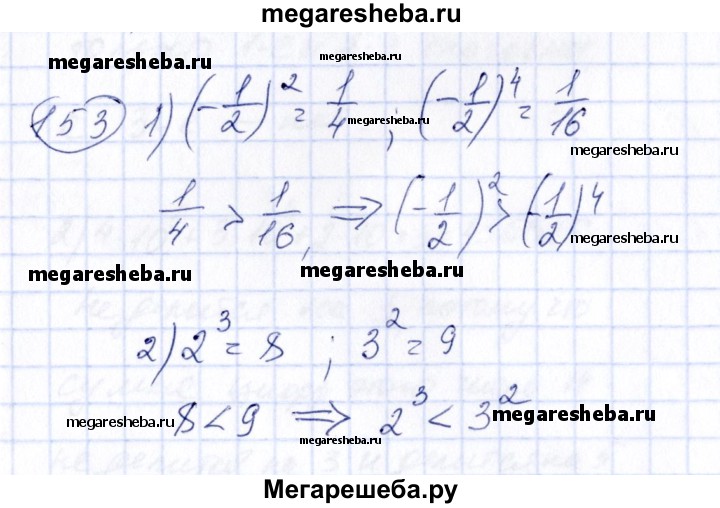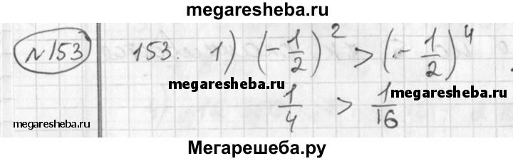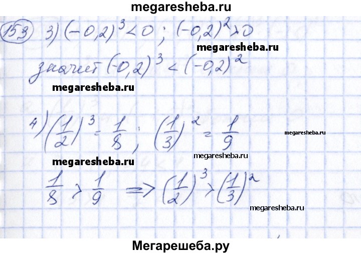 153. Установить какое из чисел больше: 1) (-1/2)2 или (-1/2)4 2) 2^3 или 3^2 3) (0,2)3 или (-0,2)2 4) (1/2)3 или (1/3)2