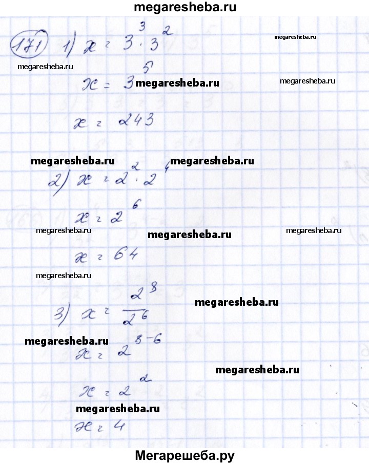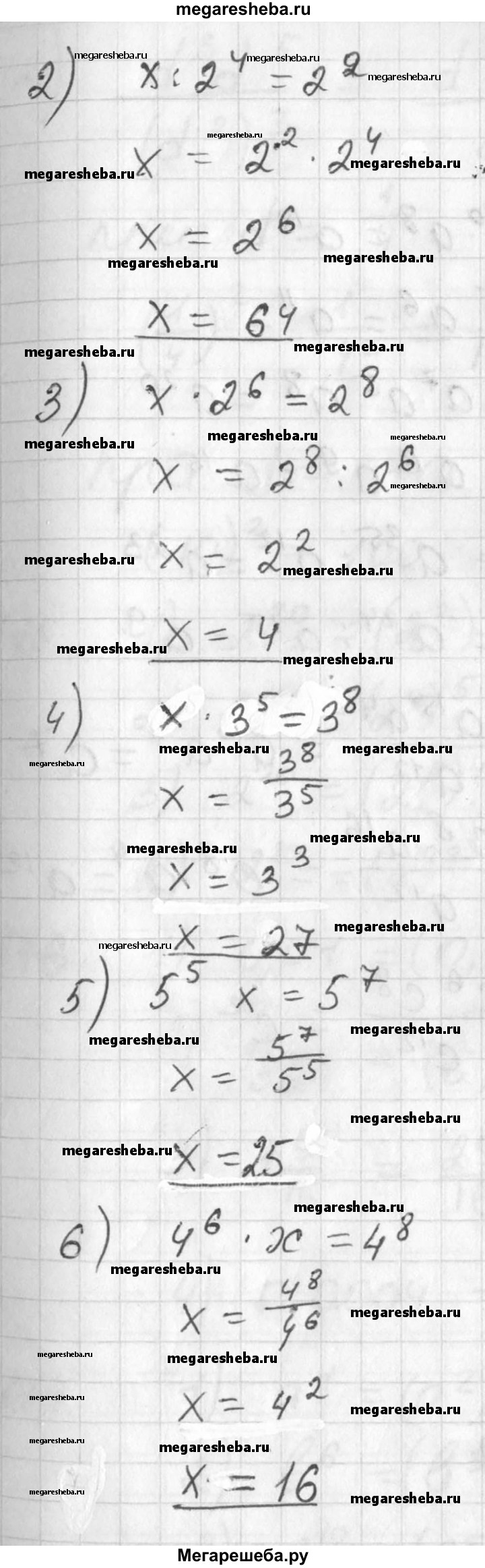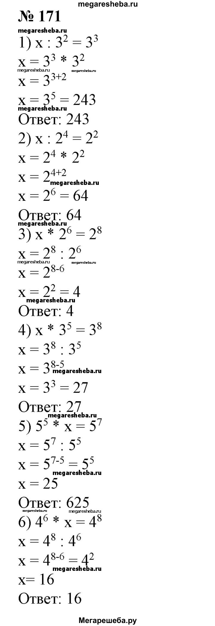 171 Решить уравнение: 1) х:3^2 = 3^3; 2) х:2^4 = 2^2; 3) x•2^6 = 2^8; 4) х•3^5 = 3^8; 5) 5^5 • х= 5^7; 6)4^6•x=4^8.'