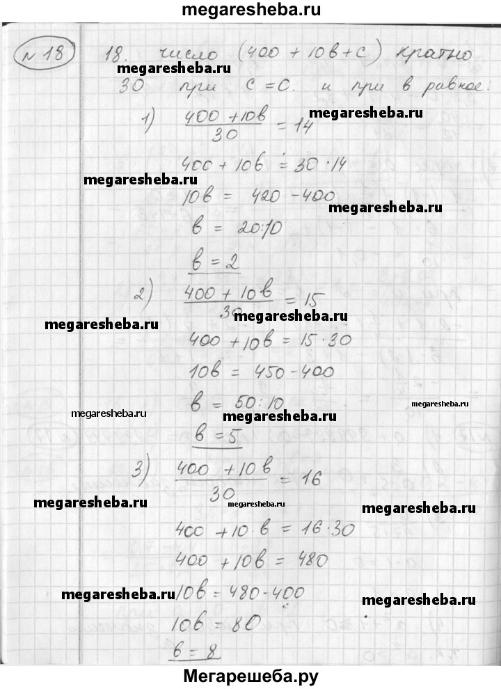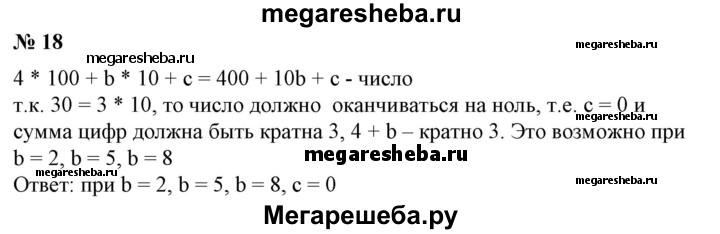18. Число содержит 4 сотни, b десятков и с единиц. При каких значениях b и с данное число кратно тридцати? Задача 1 Садовый участок имел форму прямоугольника, длина которого равна а километрам, ширина — b километрам. После осушения болота площадь участка увеличилась на 0,88 км2. Какой стала площадь садового участка? Провести вычисления для: 1) а = 2,2 и b = 0,8; 2) а = 1,4 и b = 4,3. Задача 2 Турист вышел из поселка и направился в город. Пройдя 6 км, он сел в автобус и за t часов доехал до города. 1) Найти расстояние s (в км) между поселком и городом, если автобус двигался со скоростью v (в км/ч). 2) Из полученной формулы выразить t через s и v.