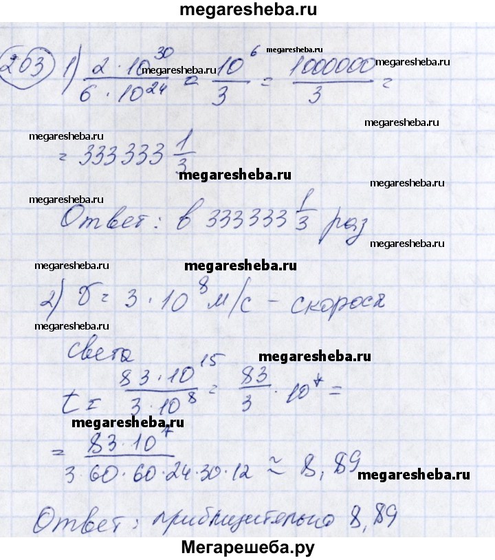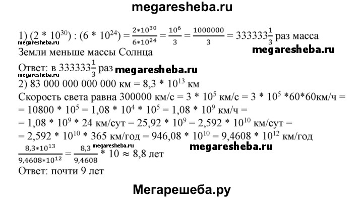 203 1) Масса Земли равна 6•10^24кг; масса Солнца – 2•10^30кг. Во сколько раз масса Земли меньше массы Солнца? 2) Расстояние от Земли д звезды Сириус 83 000 000 000 000 км. Вычислить приближенно, сколько лет луч сета идет от Земли до Сириуса.