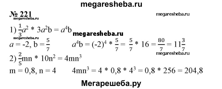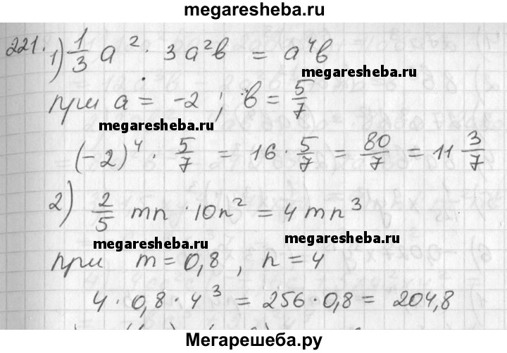 221 Выполнить умножение одночленов и найти значение по лученного выражения: 1) 1/3a2•3a2b • 3a2b при а = -2, Ь = 5/7; 2) 2/5mn • 10n2 при m= 0,8, n= 4.