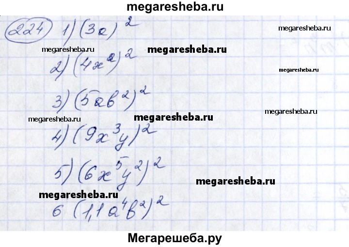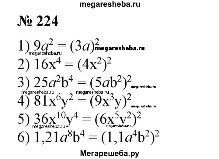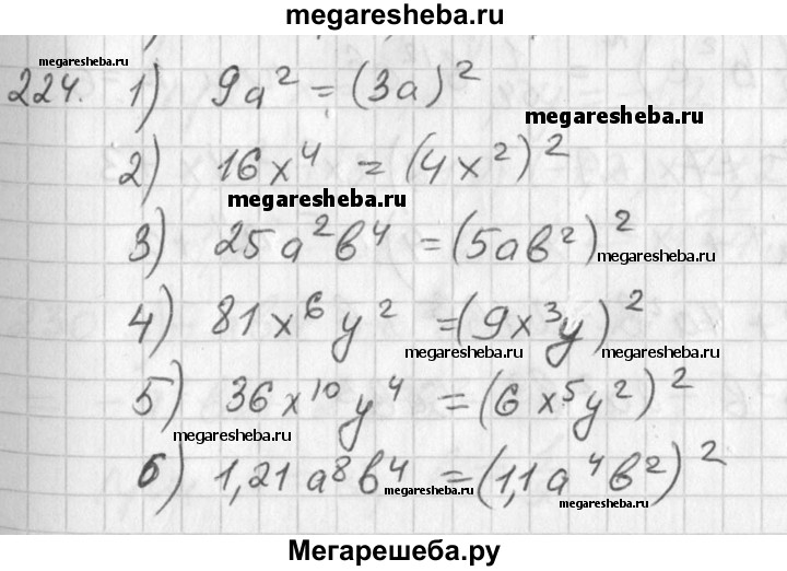 224 Записать одночлен в виде квадрата другого одночлена: 1) 9а2; 2) 16х4; 3) 25а264; 4) 81*6y2; 5) 36x10y4; 6) 1,21а8b4.