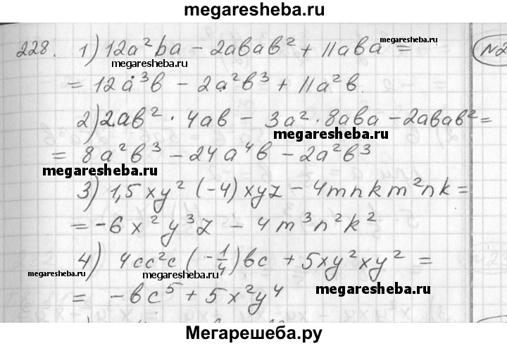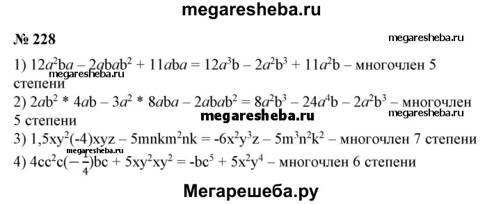 228 Упростить многочлен, записав каждый его член в стандартном виде: 1) 12a2ba-2abab2 + 11aba; 2) 2ab2 -4ab - За2 -8aba - 2abab2; 3) 1,5xy2 (-4)xyz - 4mnkm2nk; 4) 4cc2c(-1/4)bc + 5xy2xy2.