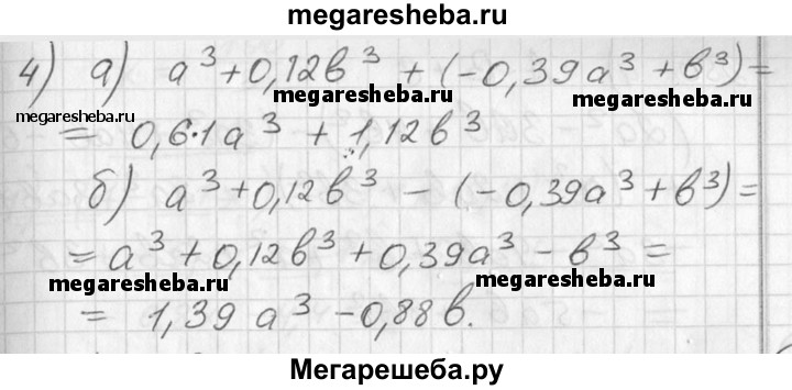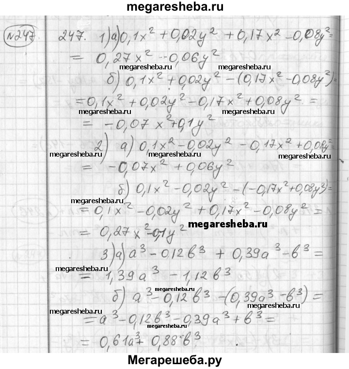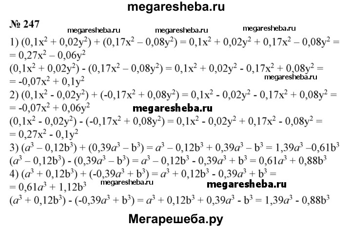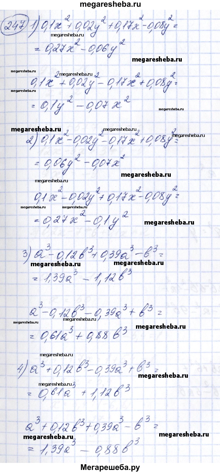 247 Найти сумму и разность многочленов: 1) 0,1х2 + 0,02у2 и 0,17x2 - 0,08у2; 2) 0,1х2 -0,02у2 и -0,17x2 +0,08у2; 3) а3 - 0,12b3 и 0,39а3 - b3; 4) а3 + 0,12b3 и -0,39а3 + b3.