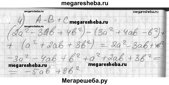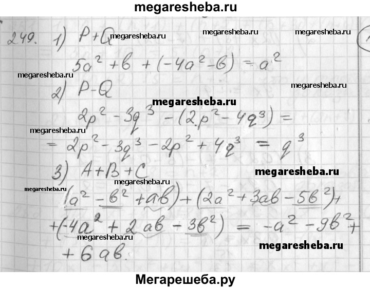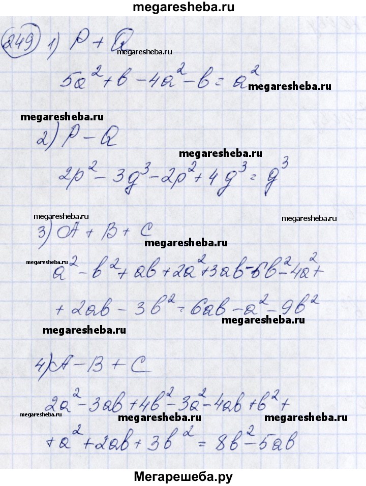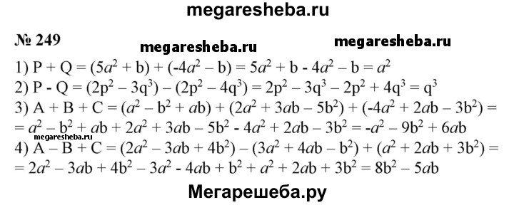 249 Упростить выражение: 1) P + Q, если Р = 5а2 +b, Q = -4a2-b; 2) P-Q, если Р=2р2 - 3q3, Q =2р2 - 4q3; 3) А + В + С, если А = а2 - b2 + ab, В = 2а2 + Заb - 5b2, С = -4а2 + 2ab - Зb2; 4) А - В + С, если А = 2а2 - Заb + 4b2, В = За2 + 4ab - b2, С = а2 + 2аb + Зb2.