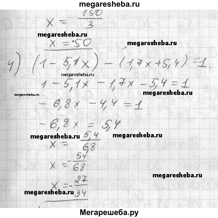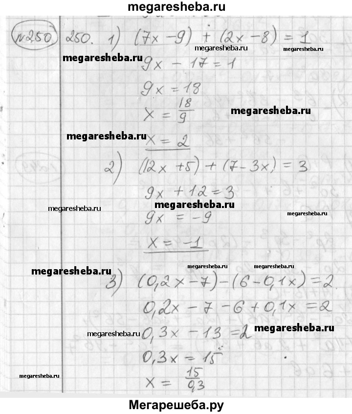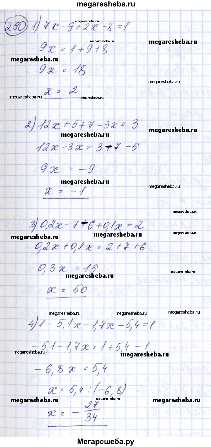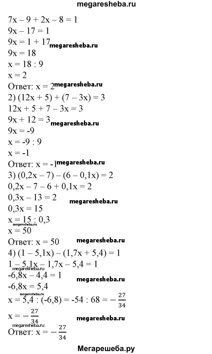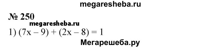 250 Решить уравнение: 1) (7х —9) + (2х-8) = 1; 2) (12x + 5) + (7-3x) = 3; 3) (0,2x - 7) — (6 - 0,1 х) = 2; 4) (1 - 5,1x) - (1,7x + 5,4) = 1.