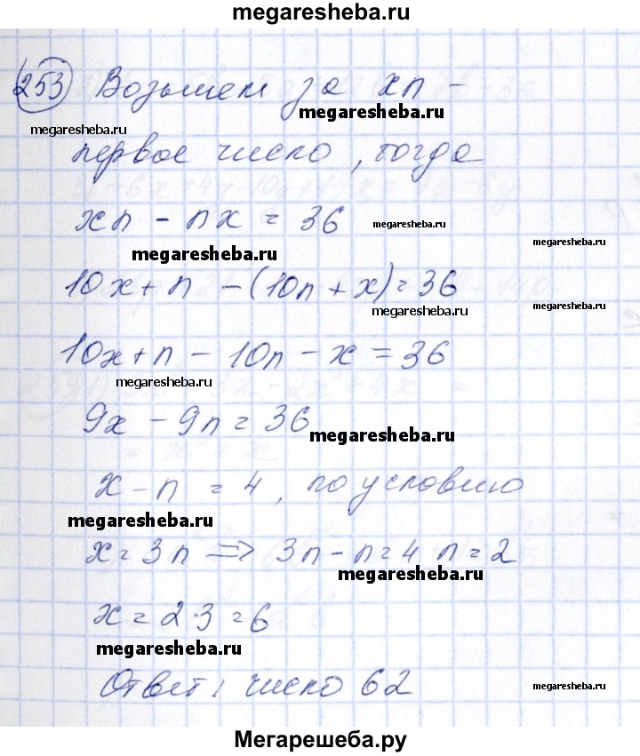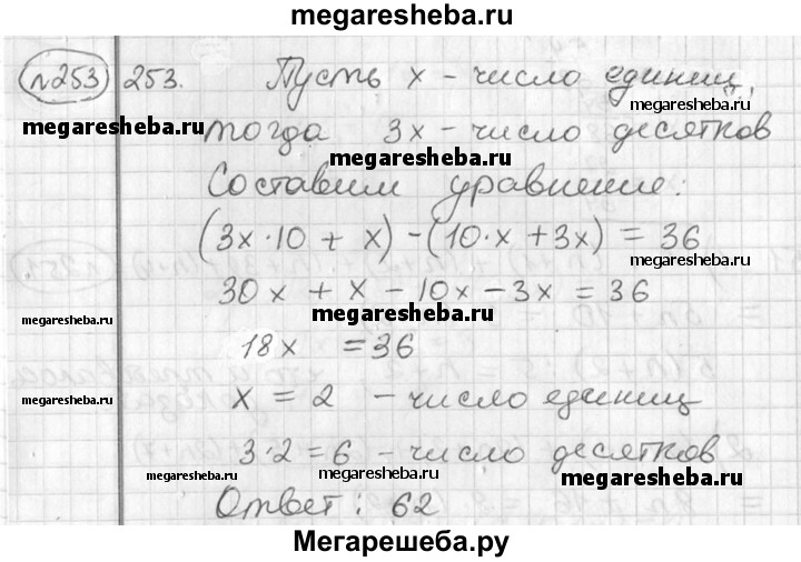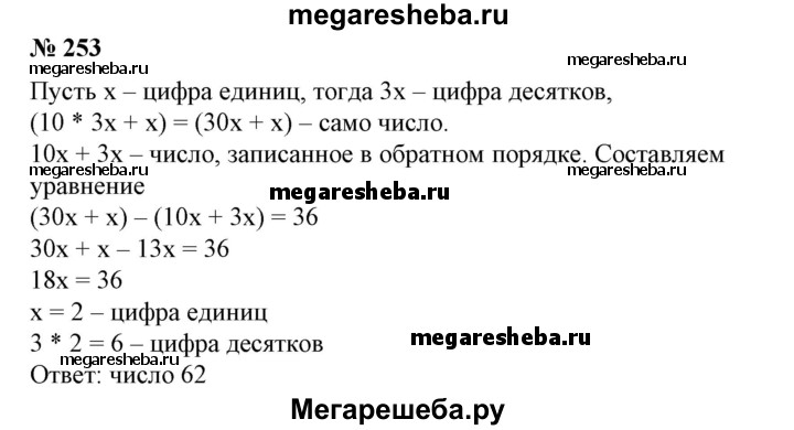 253 В двузначном числе десятков втрое больше, чем единиц. Если от этого числа отнять число, записанное теми же цифрами, но в обратном порядке, то получится 36. Найти число.