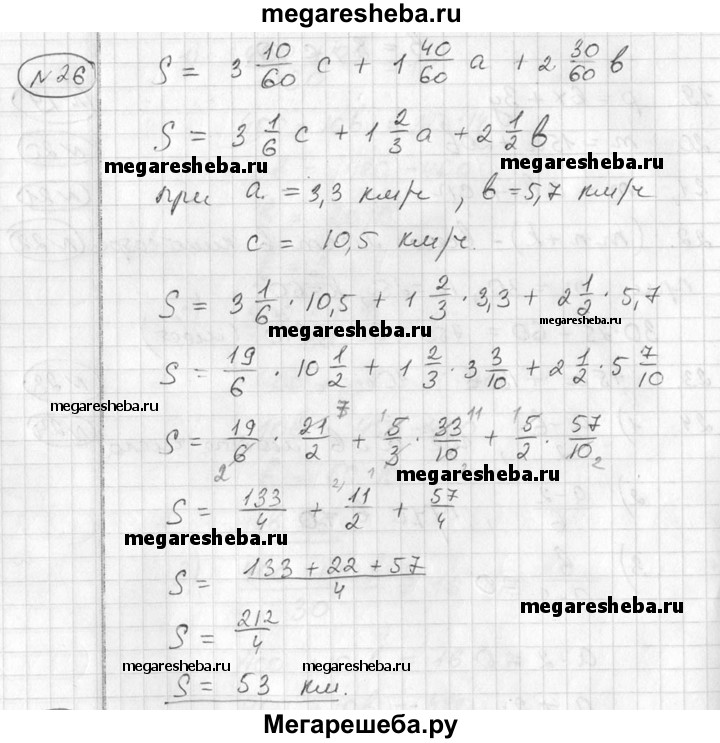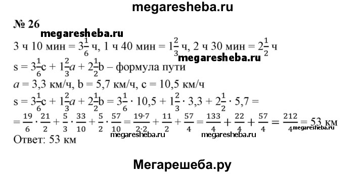 26. Группа геологов, продвигаясь по своему маршруту, ехала верхом на лошадях 3 ч 10 мин со скоростью с километров в час, затем плыла на плоту 1 ч 40 мин по реке, скорость течения которой а километров в час, и, наконец, шла пешком 2 ч 30 мин со скоростью b километров в час. Написать формулу пути, который преодолели геологи, обозначив длину маршрута (в км) буквой s. Вычислить длину маршрута, если а = 3,3 км/ч, b = 5,7 км/ч, с = 10,5 км/ч.
