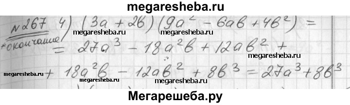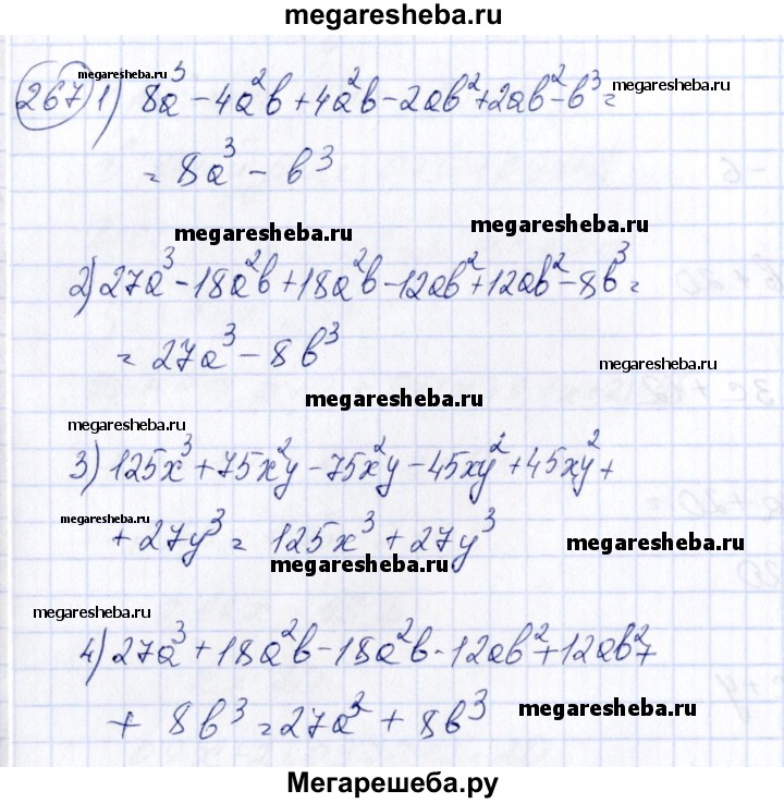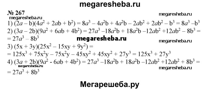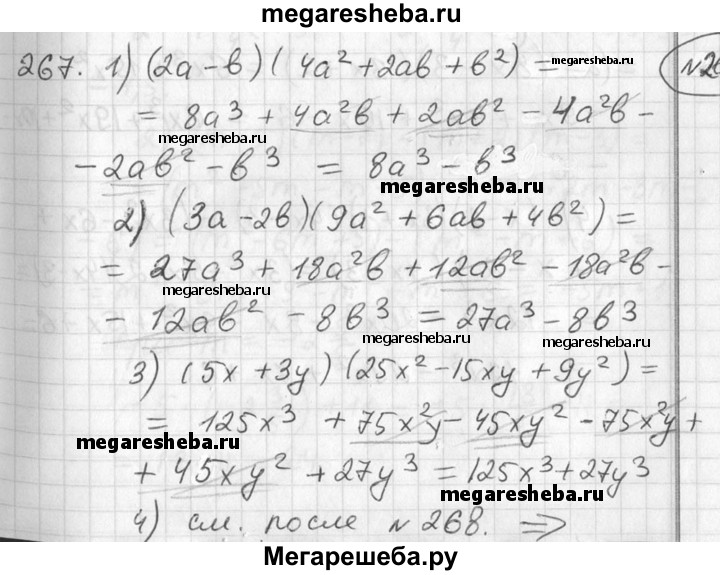 267 1) (2а-b)(4а2 + 2 ab + b2); 2) (За – 2b)( 9а2 + 6аb + 4b2); 3) (5x + Зу)(25х2 - 15ху + 9у2); 4) (За + 2b)(9а2 - 6аb + 4b2).