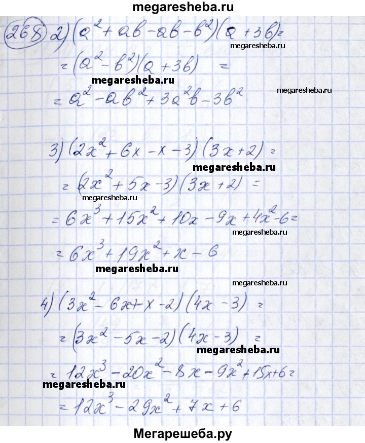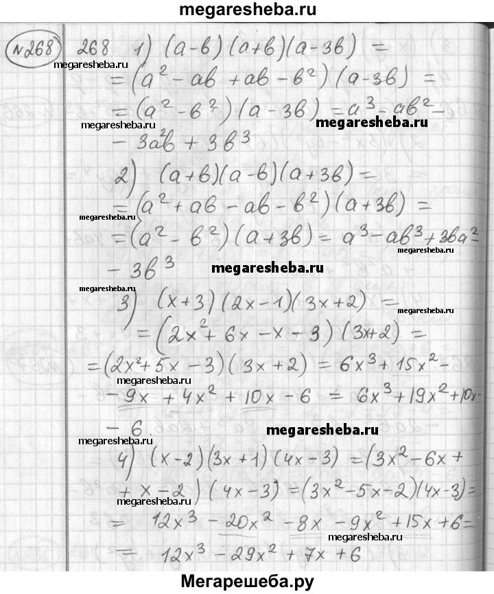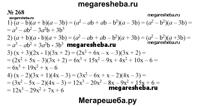 268 1) (а - b)(а + b)(а – 3b); 2) (а+b)(а-b)(а + 3b); 3) (x + 3)(2л:-1)(Зx + 2); 3) (x-2)(3x+1)(4x-3).