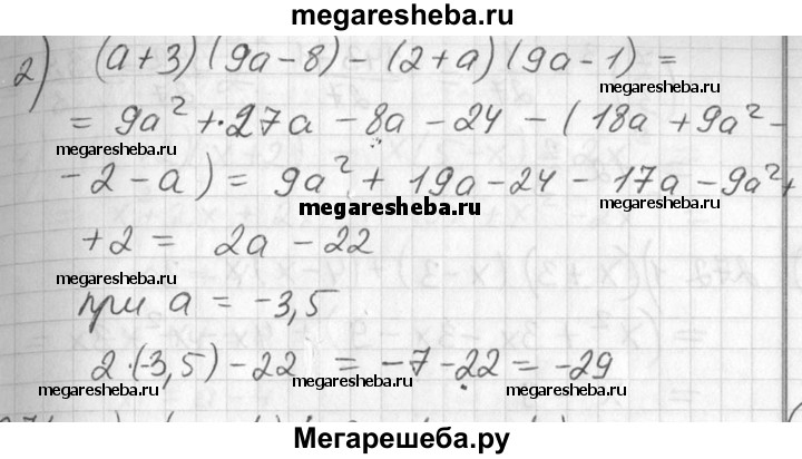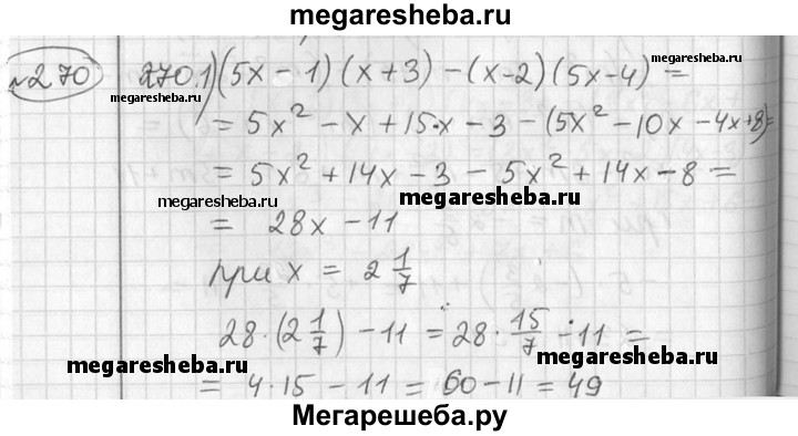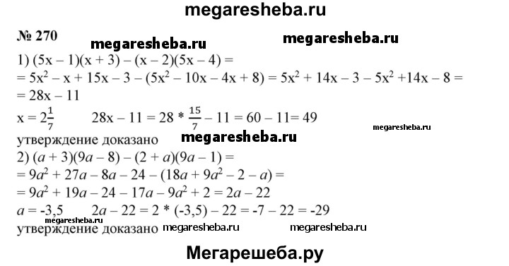 270 1) Показать, что при x = 2 1/7 значение выражения (5x-1)(x + 3)-(x-2)(5x-4) равно 49. 2) Показать, что при a = -3,5 значение выражения (а + 3) (9а - 8) - (2 + а)(9а - 1) равно -29.