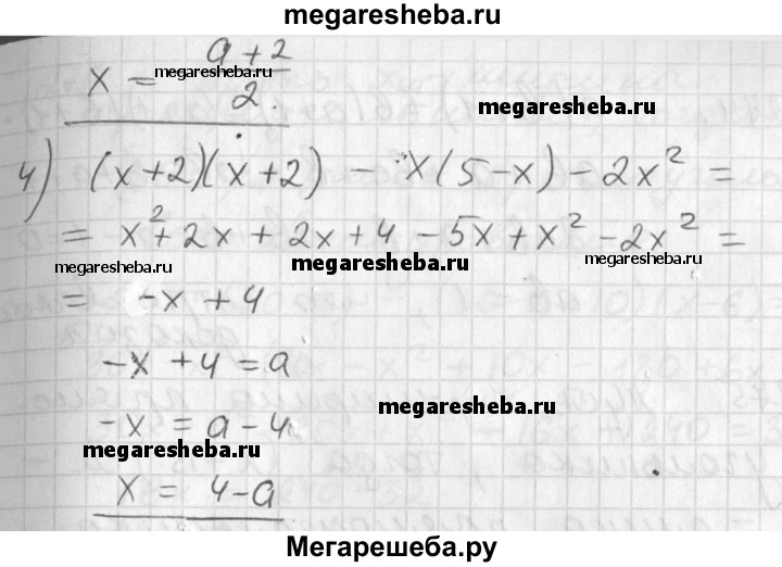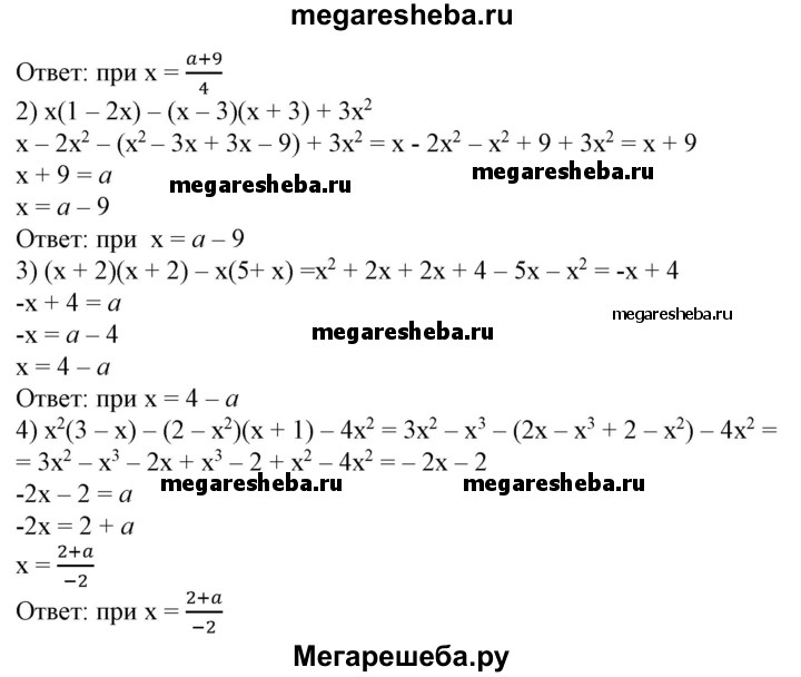 272 Упростить выражение и выяснить, при каком значении х значение выражения равно а: 1) (x + 3)(x-3)+(4-x)x-3x; 2) х(1-2х)-(х-3)(х + 3) + 3х2; 3) x2 (3- x) - (2 - x2 )(x + 1) – 4x2; 4) (х + 2)(х + 2) - х(5 — х) - 2х2.