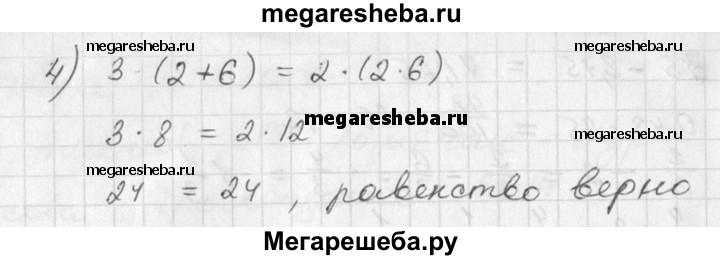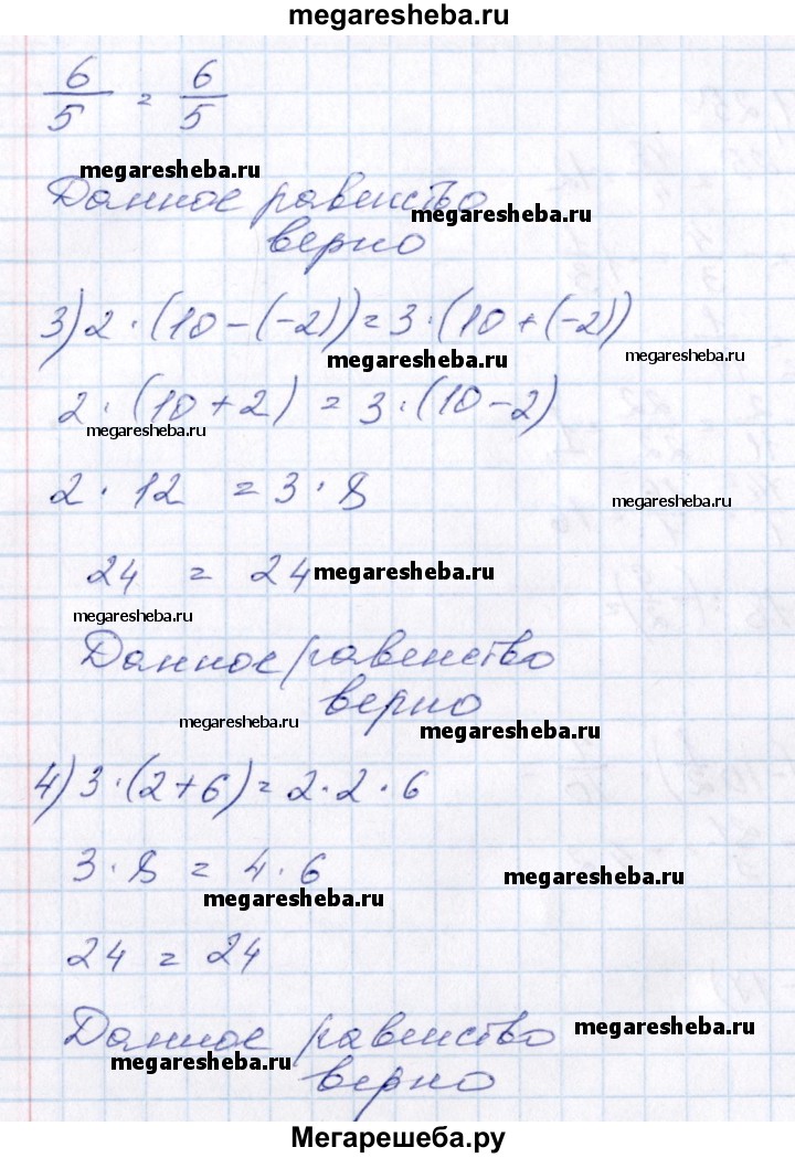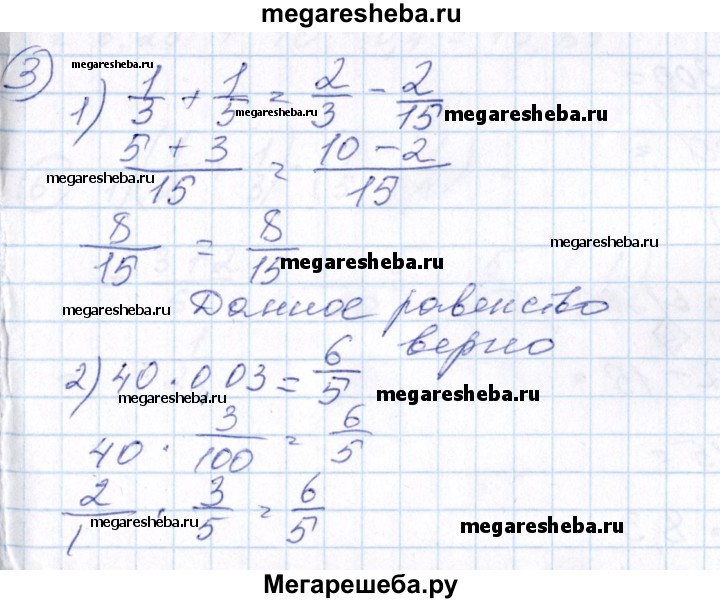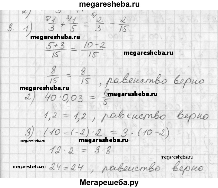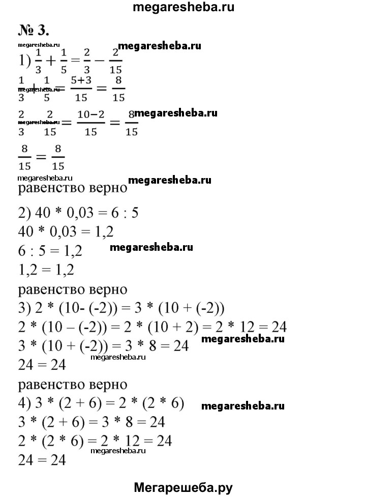 3. Записать в виде числового равенства и проверить, верно ли оно: 1) сумма чисел 1/3 и 1/5 равна разности чисел 2/3 и 2/15; 2) произведение чисел 40 и 0,03 равно частному от деления числа 6 на число 5; 3) удвоенная разность чисел 10 и -2 в три раза больше суммы этих же чисел; 4) утроенная сумма чисел 2 и 6 в два раза больше произведения этих же чисел.
