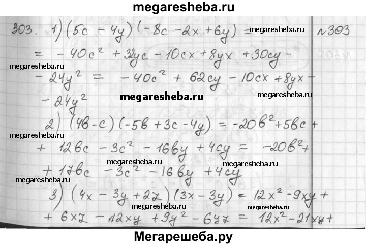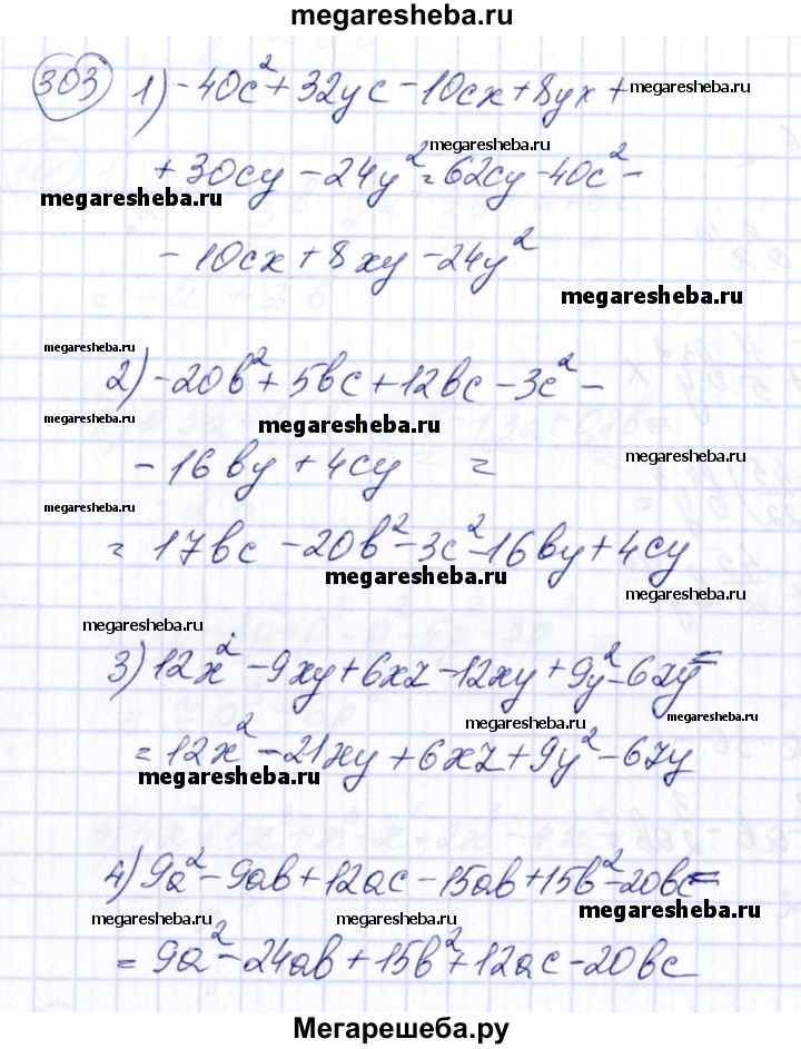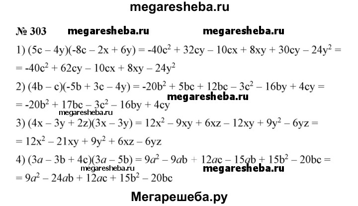303 1) (5с – 4y)(-8с -2х + 6у) 2) (4b-с)(-5b + Зс-4у); 3) (4x-3y + 2z)(3x-3y); 4) (За — ЗЬ + 4с)(3а – 5b).