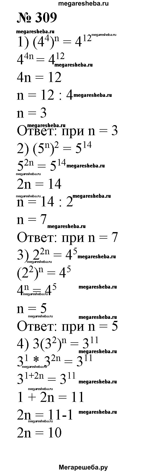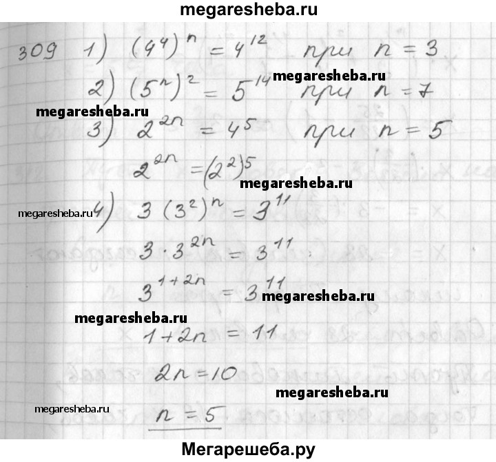 309 При каком значении n верно равенство: 1) (4^4)" = 4^12; 2) (5^n)2 = 5^14; 3) 2^n = 4^5; 4) 3(3^2)n = З^11?
