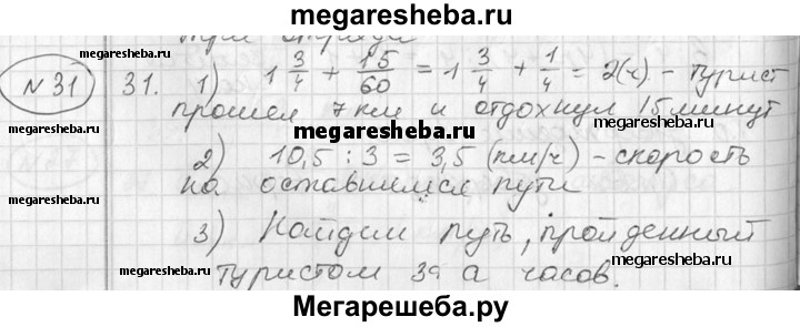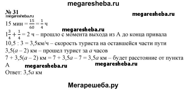 31. Турист вышел из пункта А и прошел 7км ха 1 3/4 ч, затем сделал привал на 15 мин, после чего прошел оставшиеся 10,5 км за 3 ч. На каком расстоянии от пункта А находился турист через а часов, где 2 <а <5? Задача 1 Вычислить 15+37+25+13 Задача 2 Упростить выражение 3(2а+4Ь) + 5(7а + b). Задача 3 На пути из Москвы в Санкт-Петербург расположен город Тверь. Расстояние между Москвой и Санкт-Петербургом равно 650 км, а между Москвой и Тверью — 167 км. Найти расстояние между Тверью и Санкт-Петербургом. Задача 4 Найти значение выражения 4(3х-5у) + 6(х-у) при х = 1/2, у = 1/13 Задача 5 Площадь прямоугольника равна 380 см2, одна из его сторон равна 95 см. Найти другую сторону прямоугольника. Задача 6 Доказать равенство а+ b/c = a/c + b/c, где с c≠0.