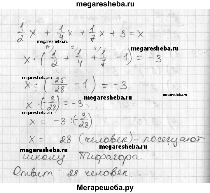 310 — Скажи мне, знаменитый Пифагор, сколько учеников посещают твою школу и слушают твои беседы? — Вот сколько, — ответил философ. — Половина изучает математику, четверть — музыку, седьмая часть пребывает в молчании, и, кроме того, есть еще три ученика.