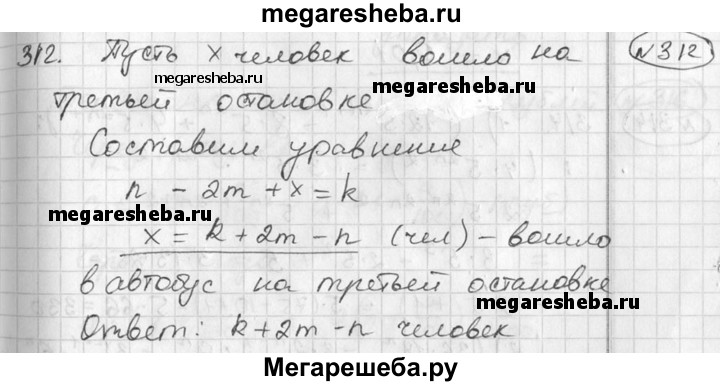 312 В автобусе было п пассажиров. На первых двух остановках вышло по т человек на каждой остановке, а на третьей никто не вышел, но вошло несколько человек, после чего в автобусе стало k пассажиров. Сколько человек вошло в автобус на третьей остановке?