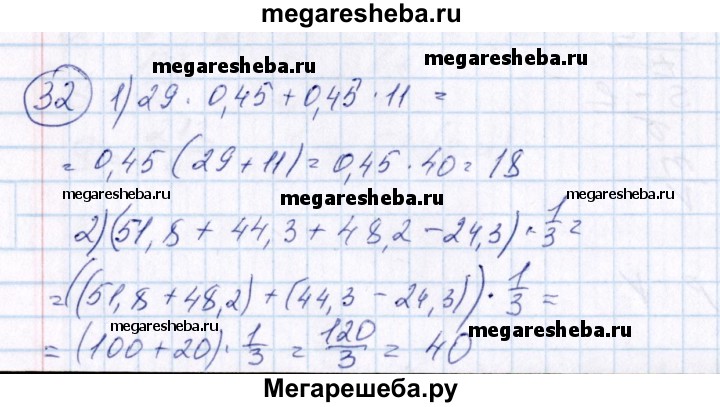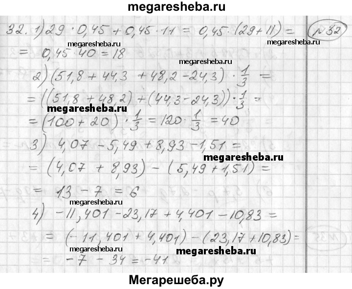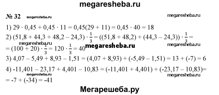 32. Найти значение числового выражения, используя законы и свойства арифметических действий: 1) 29•0,45 + 0,45•11; 2) (51,8 + 44,3+48,2-24,3)•1/3 3) 4,07-5,49 + 8,93-1,51; 4) -11,401-23,17+4,401-10,83.