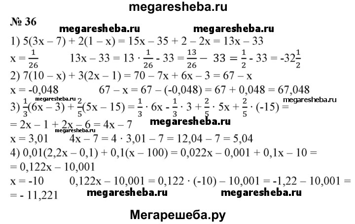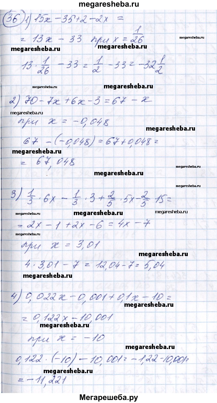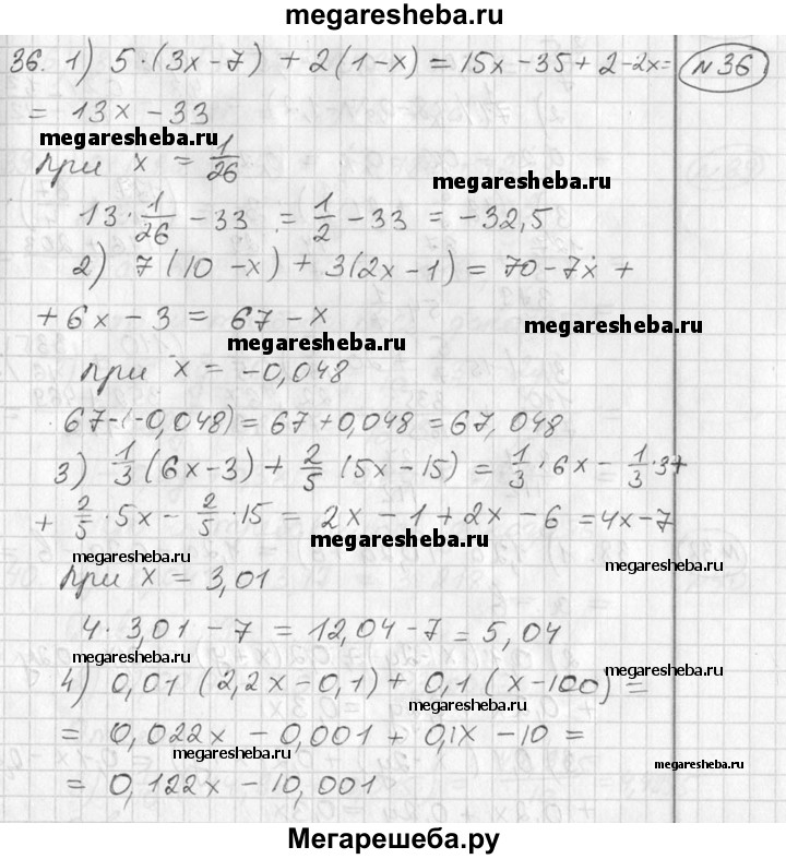 36. Упростить выражение и найти его числовое значение: 1) 5(3x-7) + 2(1-x) при х = 1/26; 2) 7(10-x) + 3(2x-1) при x = -0,048; 3) 1/3(6x-3) + §(5*-15) при х = 3,01;