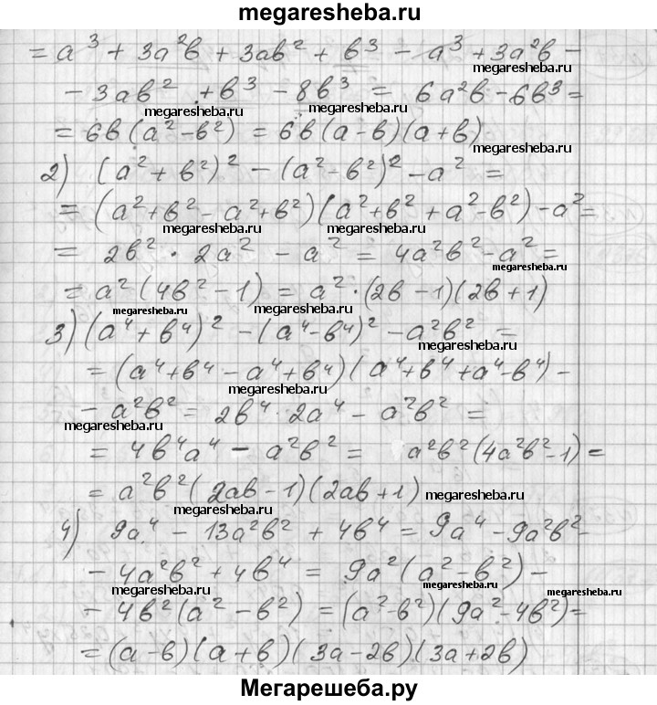 369. Разложить на множители: 1) (а + b)3 - (а-b)3 - 8Ь3; 2) (а2 + b2)2 - (а2 - b2 )2 - а2; 3) (a4 + b4)2 - (a4 -b4)2 - a2b2; 4) 9a4 – 13a2b2 + 4b4. Задача Доказать формулу (а+b)3 = а3+За2b+Заb2 + b3.