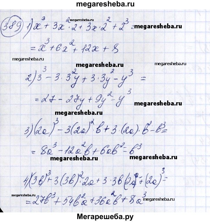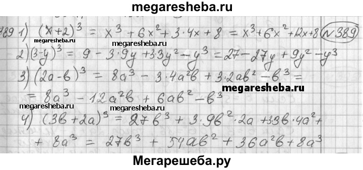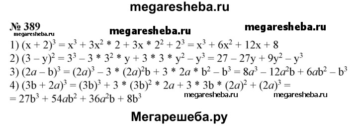 389. Используя формулы куба суммы или куба разности двух чисел, выполнить действие: 1) (х + 2)3; 2) (3-у)3; 3) (2а-b)3; 4) (Зb + 2а)3.