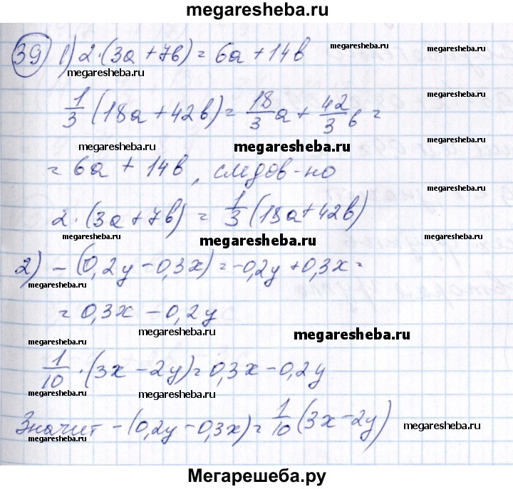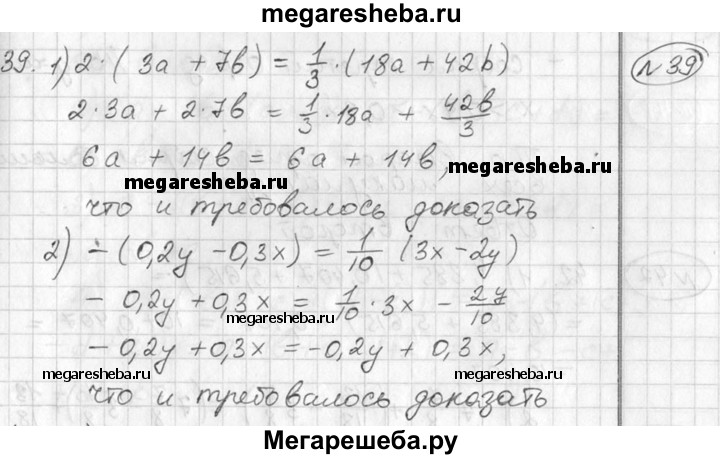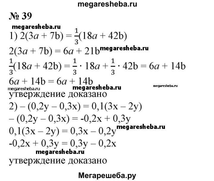 39. Доказать, что: 1) удвоенная сумма чисел За и 7b равна одной трети суммы чисел 18а и 42b; 2) число, противоположное разности чисел 0,2у и 0,3х, равно одной десятой разности чисел Зх и 2у.