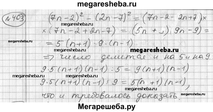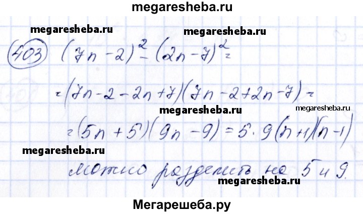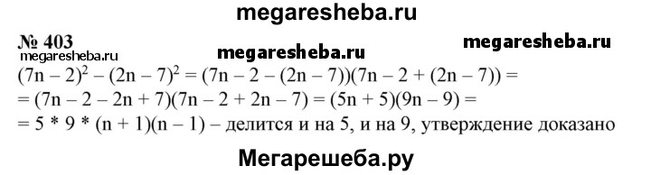 403. Доказать, что при любом целом n значение выражения (7n-2)2 —(2n-7)2 делится на 5; делится на 9.