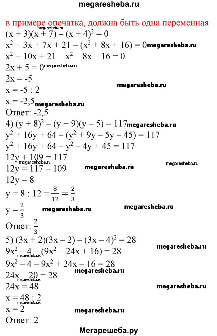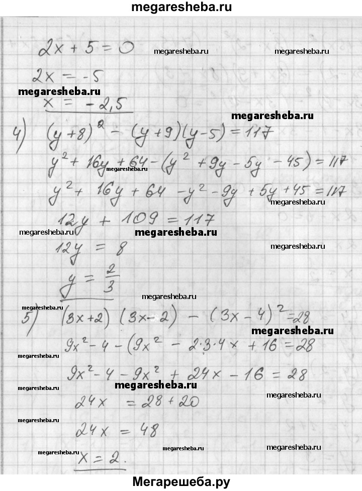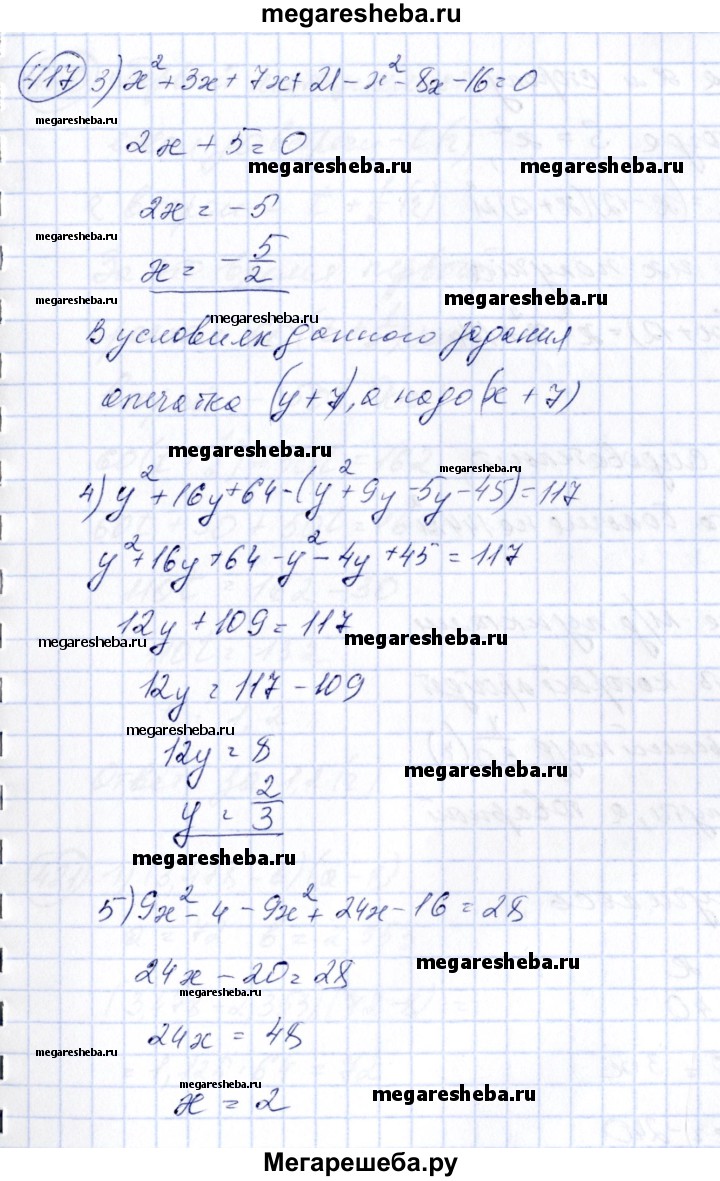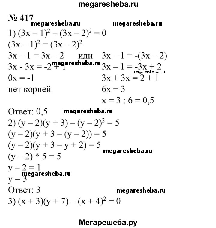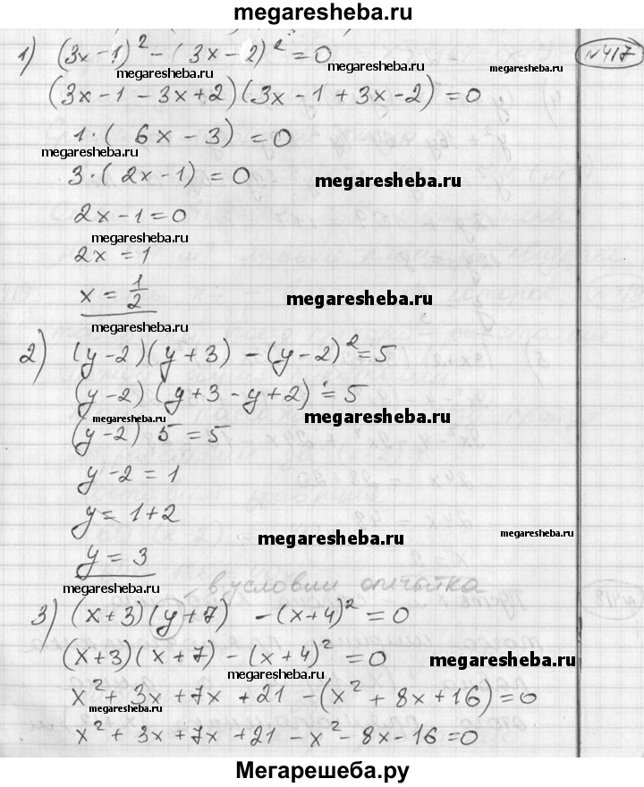 417. Решить уравнение: 1) (3x-1)2 -(Зх-2)2 =0; 2) (у-2)(у + 3)-(у-2)2 =5; 3) (x + 3)(y+7)-(x + 4)2 =0; 4) (у + 8)2 -(y + 9)(y-5) = 117; 5) (3x + 2)(3x-2)-(3x-4)2 =28