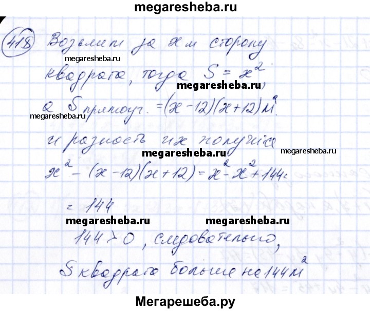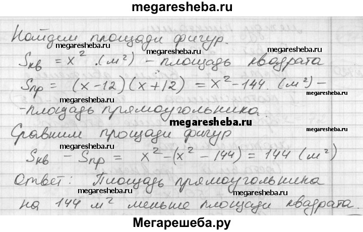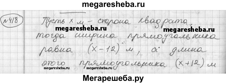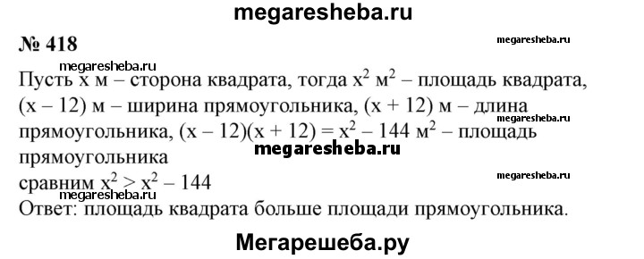 418. Ширина прямоугольника меньше стороны квадрата на 12 м, а длина этого прямоугольника больше стороны того же квадрата на 12 м. Сравнить площади прямоугольника и квадрата.