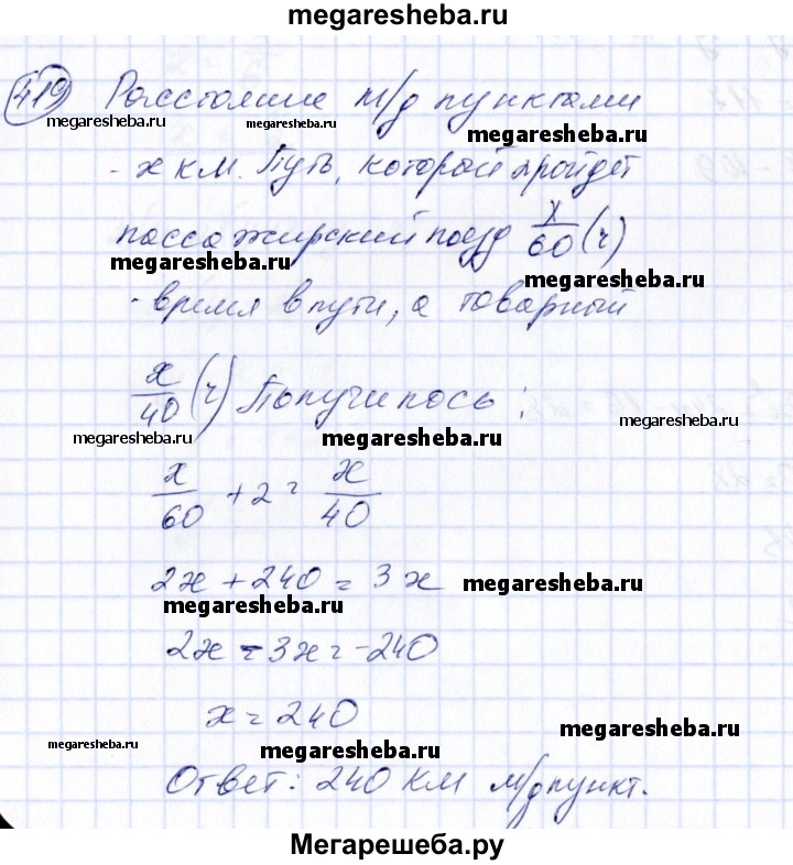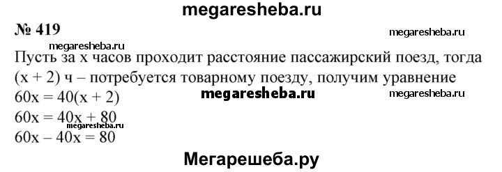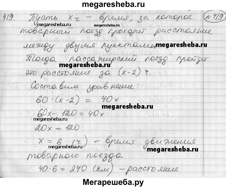 419. Скорость пассажирского поезда равна 60 км/ч, а товарного — 40 км/ч. Найти расстояние между двумя пунктами, если пассажирский поезд проходит это расстояние на 2 ч быстрее, чем товарный.