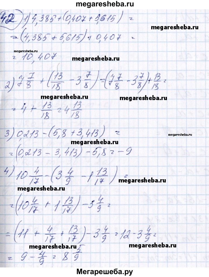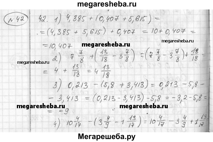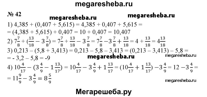 42. Вычислить, используя свойства арифметических действий: 1) 4,385 + (0,407 + 5,615); 2) 7 7/8+(13/18-3 7/8) 3) 0,213 – (5,8+3,413) 4)10 4/17 – (3 4/9-1 13/17)
